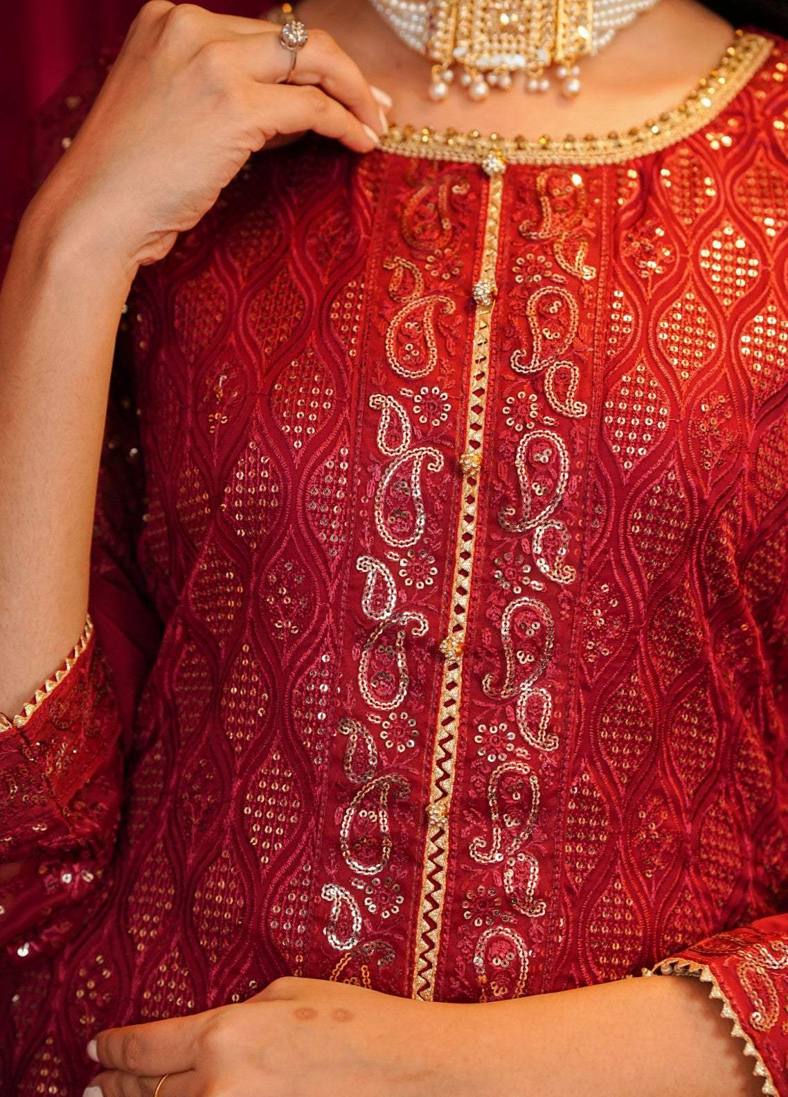 This stunning ensemble is crafted on premium chiffon fabric, beautifully adorned with intricate chikan kari embroidery and delicate thread work that adds timeless charm. The neckline is accentuated with exquisite hand embellishments, lending a regal touch to the design. Featuring a graceful front-open double shirt style, this outfit combines elegance with a contemporary silhouette. The rich maroon hue paired with its detailed embroidery makes it an ideal choice for festive occasions, weddings, and formal gatherings.