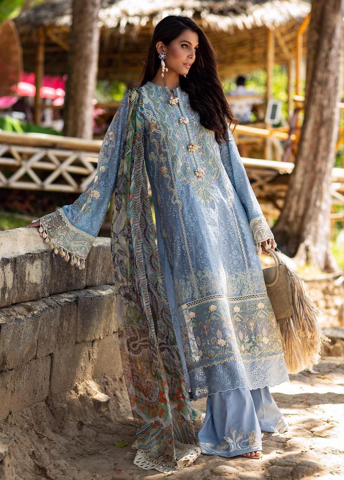 A periwinkle blue lawn ensemble is inspired by the serene beauty of Phuket and features continuous Schiffli detailing on the shirt and sleeves. The shirt has scalloped edges with intricate floral designs and linear botanical and satin stitch embroidery with ribbon style accents, showcasing Thai fusion. The back of the shirt has expertly crafted Schiffli motifs to capture the essence of the tropical paradise. The outfit is paired with a buttercream chiffon dupatta with blooming botanical garden imagery and periwinkle blue cotton pants, which have been dyed to match the aesthetic inspired by Phuket.