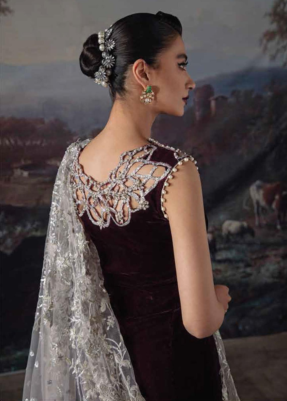 Sequined velvet for front yoke Plain velvet for back yoke Plain velvet Hand embellished front neckline Hand embellished back neckline Hand embellished motifs Embroidered and sequined border for hem Embroidered and sequined motifs for sleeves Embroidered and sequined patti on silk Embroidered and sequined patti 2 on silk Sequined border for dupatta/sari Embroidered and sequined net dupatta Raw silk trouser Pearls for finishing