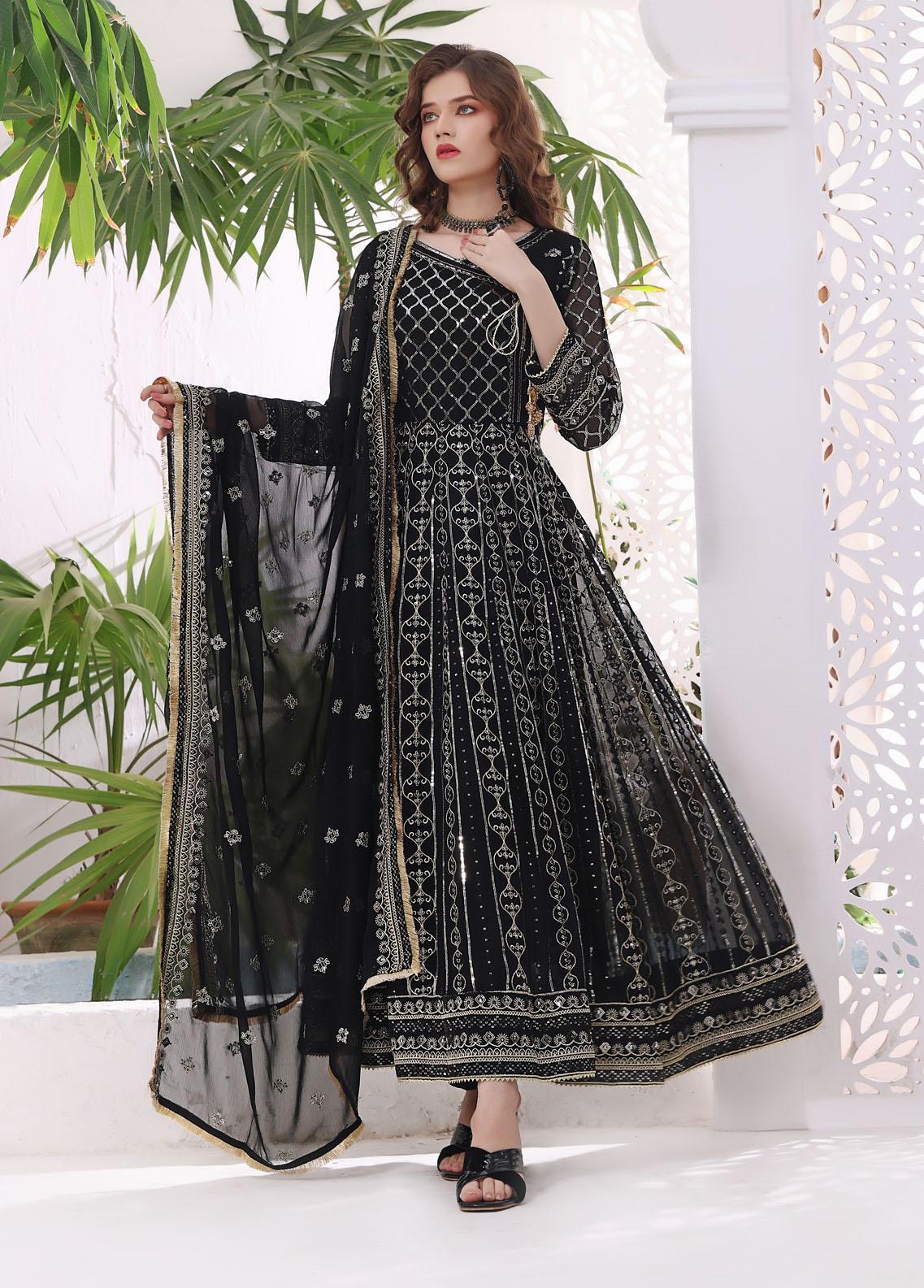 Uniquely charming this 3 piece anghrakha frock set enchants with chiffon s shimmering sequence and zari work embroidered flowers grace sleeves and dupatta corners The frock s special patterns and fine stitches paired with plain trousers exude simple elegance