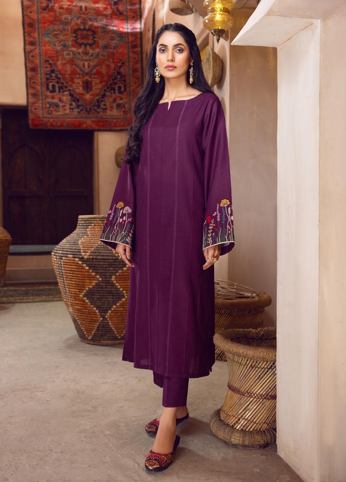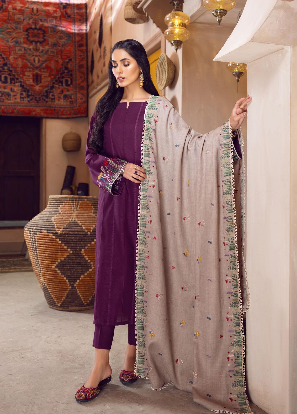 Aelia features delicate embroidery on a plum soft pure khaddar shirt forming gorgeous patterns elaborately on the sleeves. The gorgeous 9 color embroidery shawl embodying a warm silhouette is crafted out of pure wool enhancing the grace of the whole look. Paired along is a pure soft khaddar canvas ethereally lifting this perfect look!
