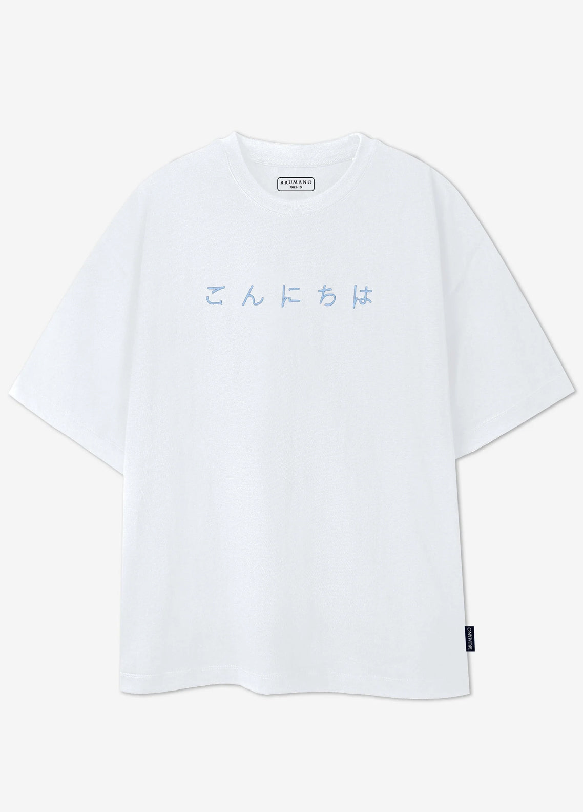 Elevate your everyday look with this white oversized t-shirt featuring minimalist Japanese embroidery 'Hello'. Crafted from soft, breathable cotton, it offers a relaxed shoulder drop fit and subtle style perfect for modern streetwear look