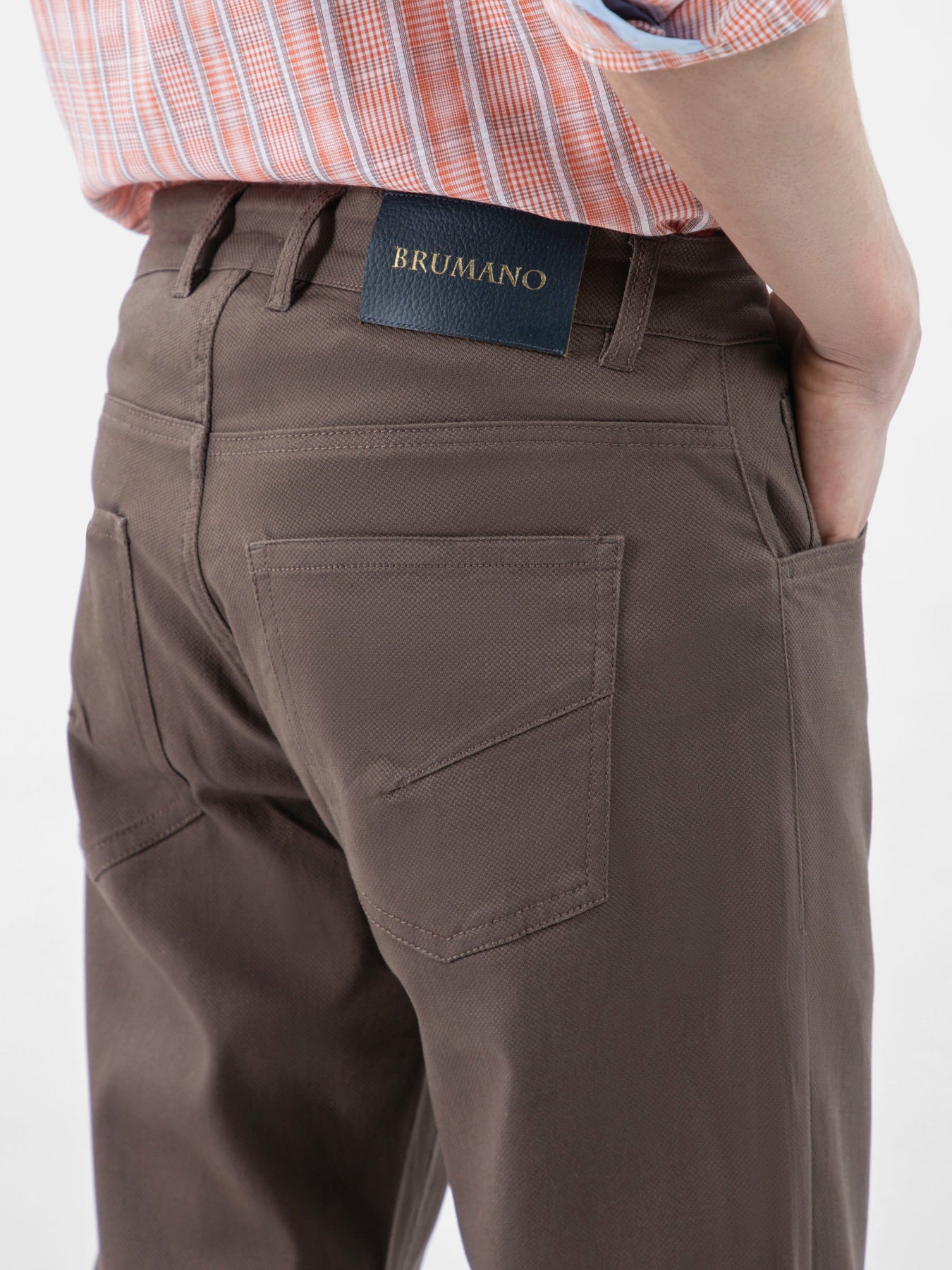 Experience comfort and style with our new brown dobby structured five pocket trousers. The dobby fabric adds a touch of texture and depth, while added stretch ensures comfortable fit & flexibility. Featuring branded navy blue leather patch at the back for modern look. Wear it with light blue shirt for a classic look