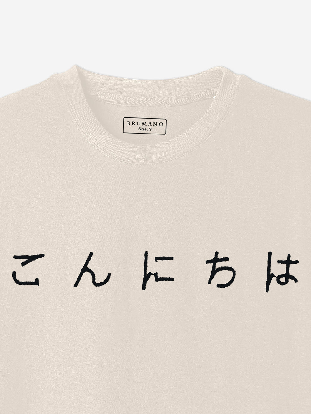 Brumano Cotton Printed Men -Beige Oversized T-Shirt With Minimalist 'Hello' Embroidery