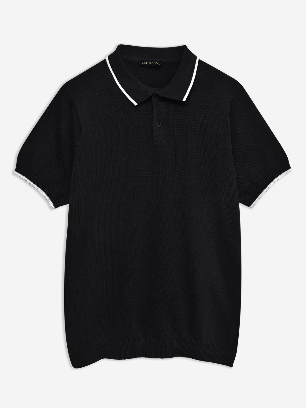 Brumano Solids Cotton Polo Black Flat Knit Polo With Tipped Collar