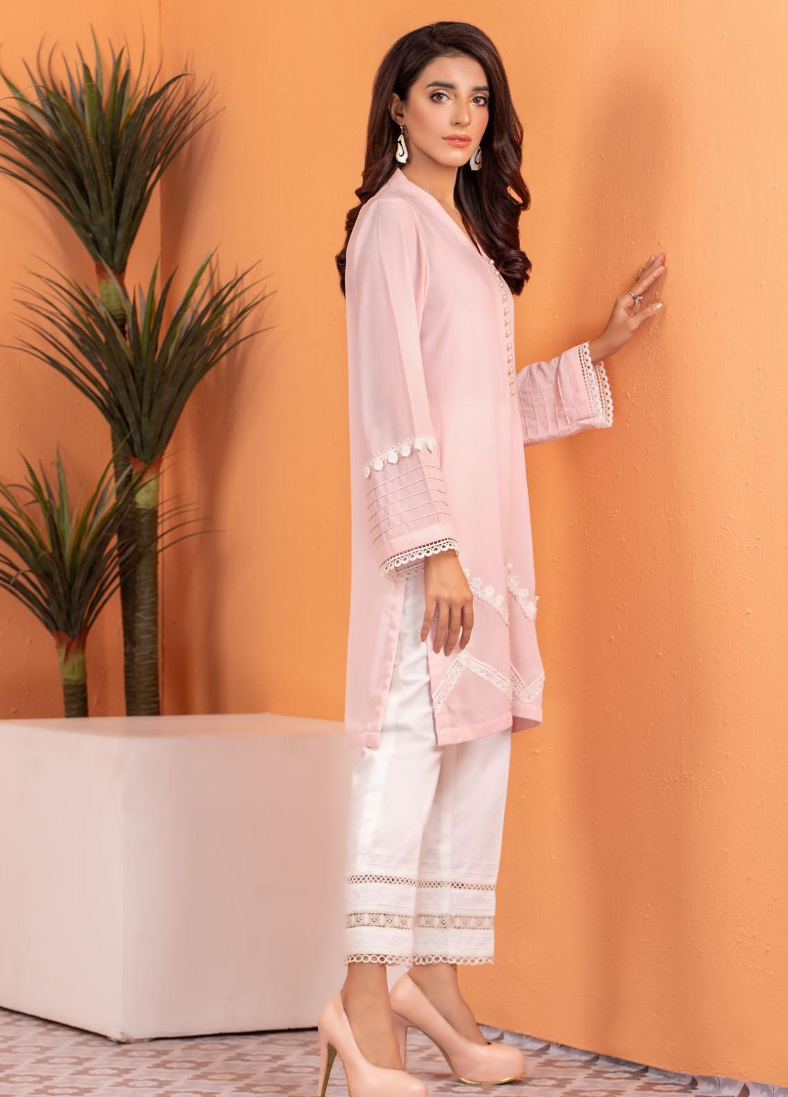 In a subtle pink, this slub shirt designed in a chic silhouette is enriched with intricate lacework at the front and sleeves with piping details.Embellished with fabric loops at the front neck.This elegant outfit is a great addition to your everyday wardrobe.