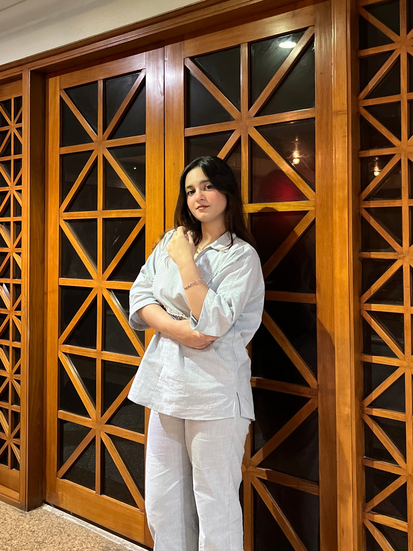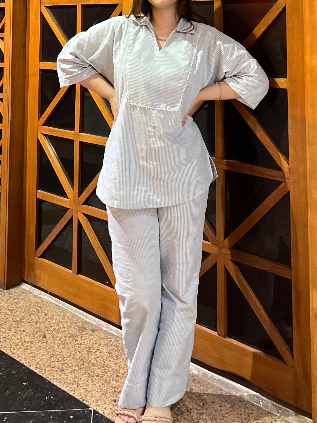 Stay effortlessly chic in this cotton 2-piece co-ord set, designed with soft vertical stripes that give a sleek look. The relaxed-fit shirt features a neat neckline with subtle detailing, paired with a straight-cut trouser for a polished yet comfortable style. Perfect for everyday casual wear, office looks, or laid-back gatherings, this co-ord set combines breathable cotton fabric with timeless elegance.