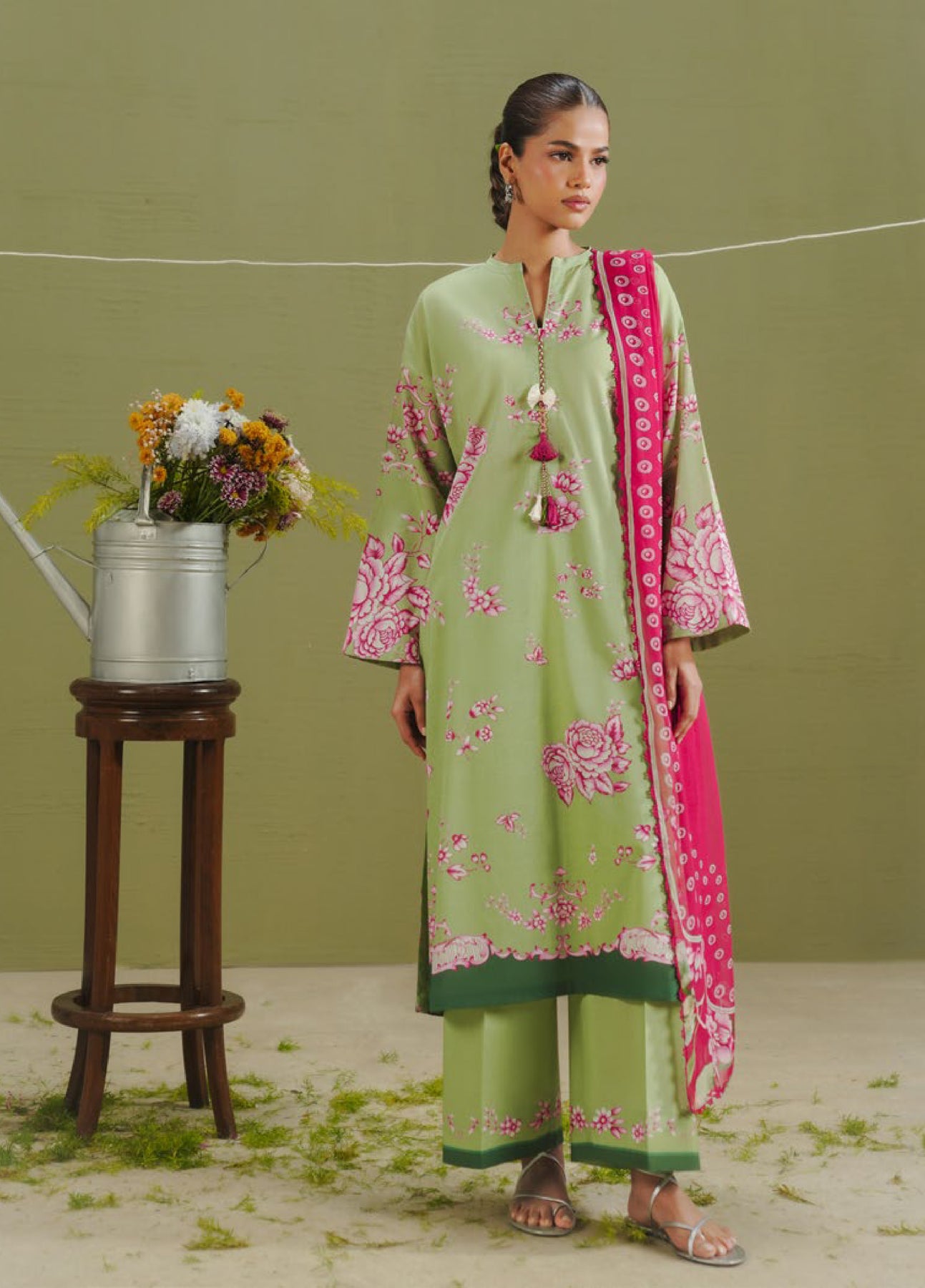 The dupatta features polka dots and gara-inspired detailing in hot pink. The shirt is printed with pink gara and floral motifs on a matcha base. The trouser is finished with a matching pink gara floral border on matcha.