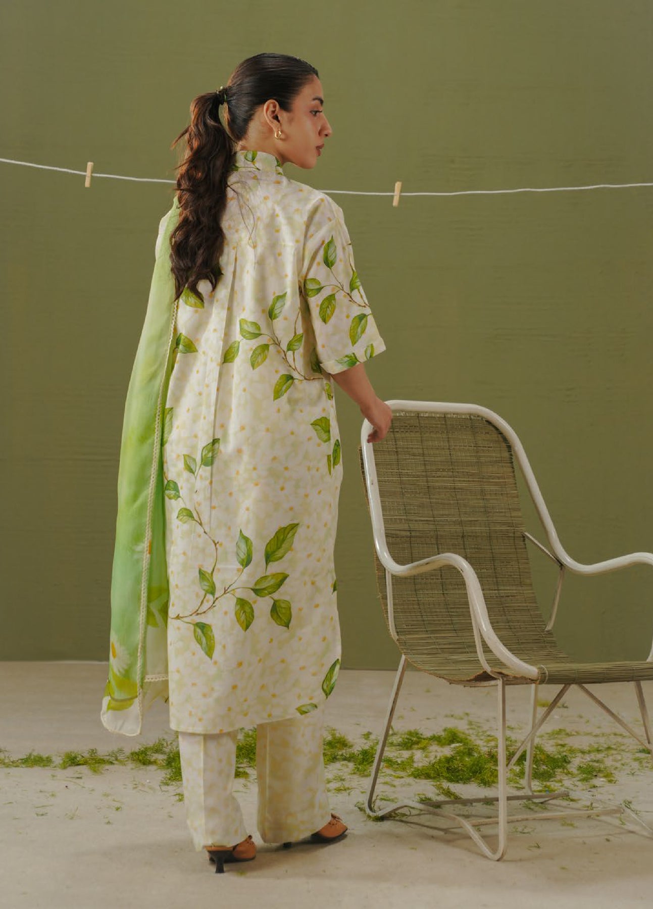 The dupatta features daisy florals layered over a watercolor-textured base in lime and green tones. The shirt and trouser carry daisy meadow inspired prints on a daisy white base.