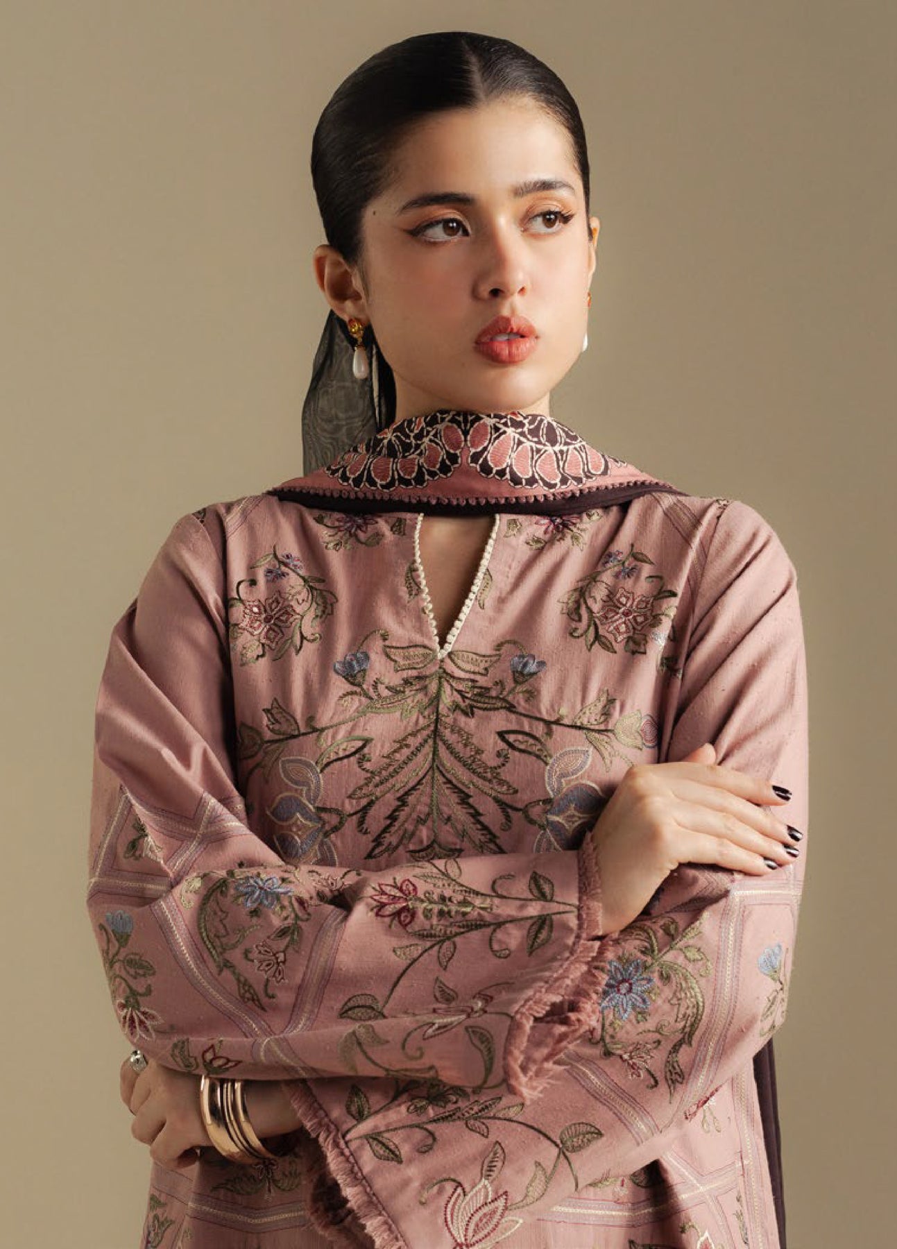 A blush pink karandi shirt and trouser paired with a deep brown and candle light peach shawl, a warm yet delicate mix that carries effortless winter charm.