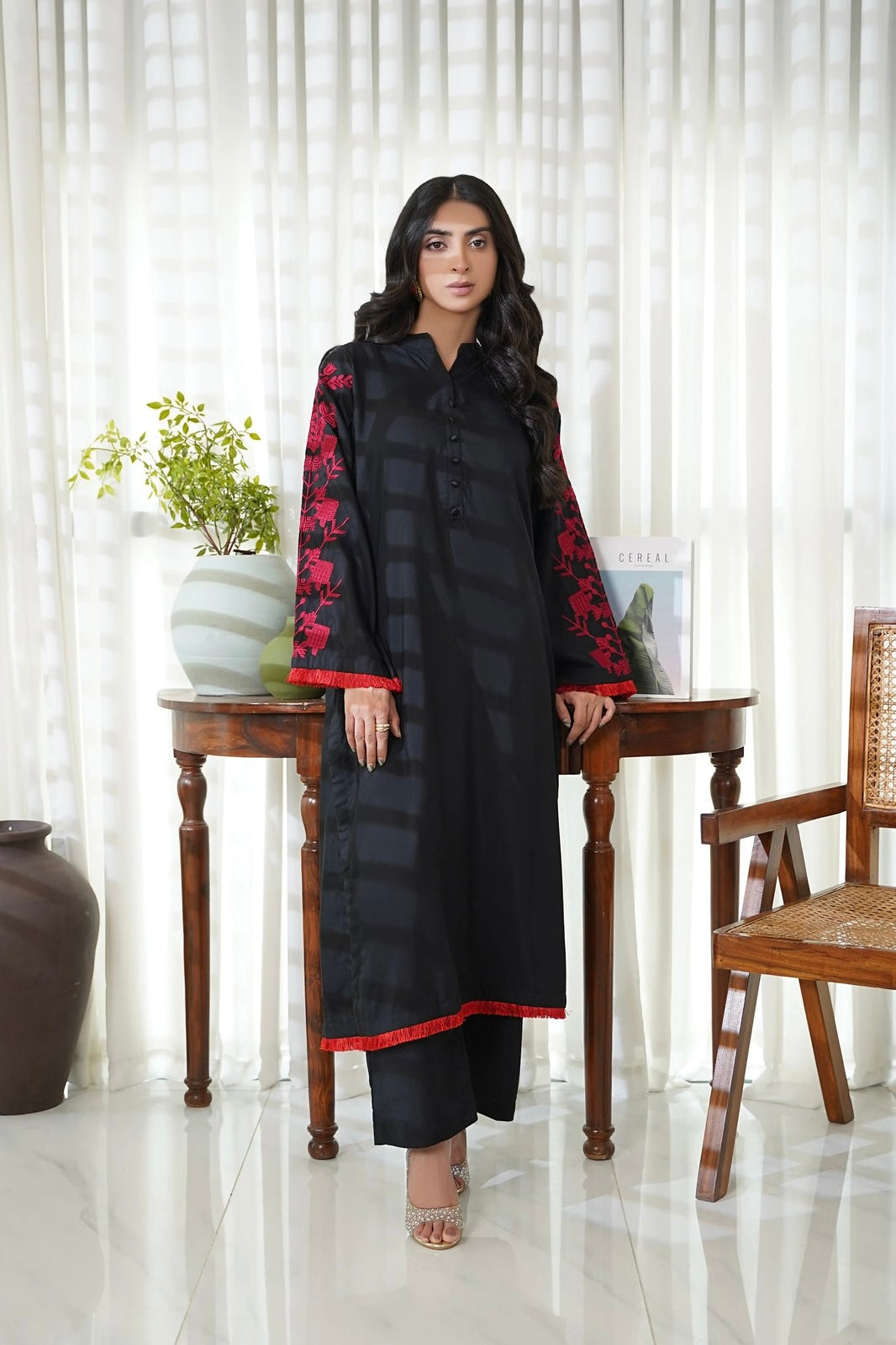 This article consists of a solid 2-piece set with an intricate embroidery detail touch on the shirt. The outfit consists of a long-length style shirt and fitted pants.