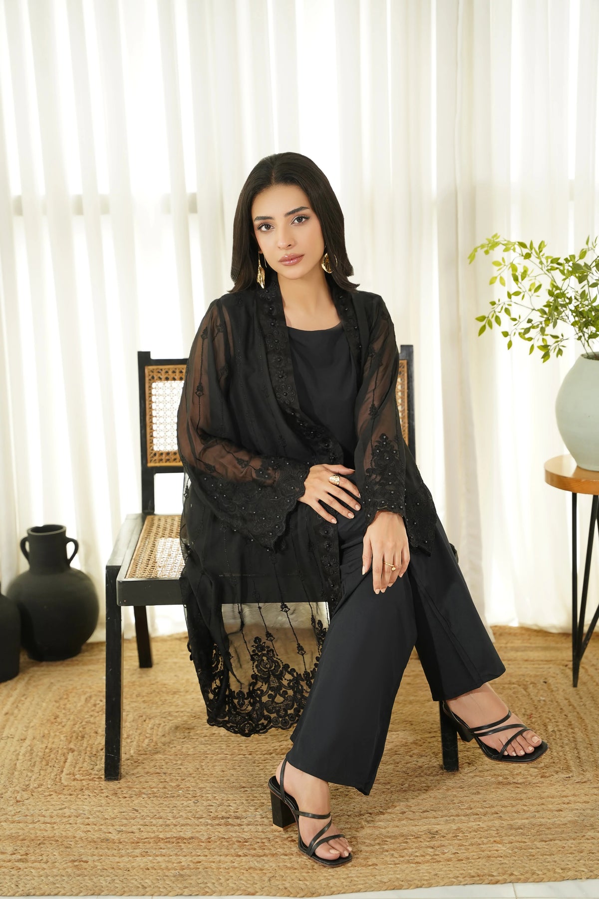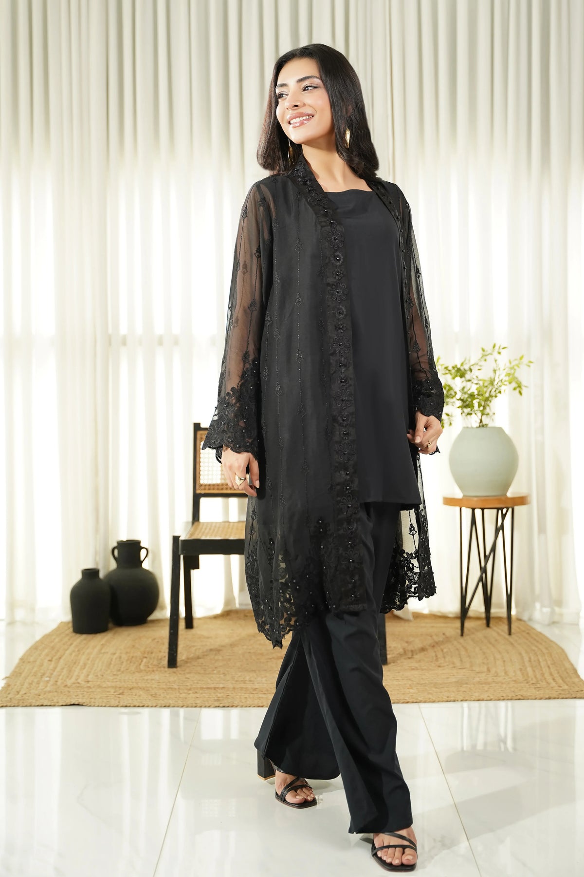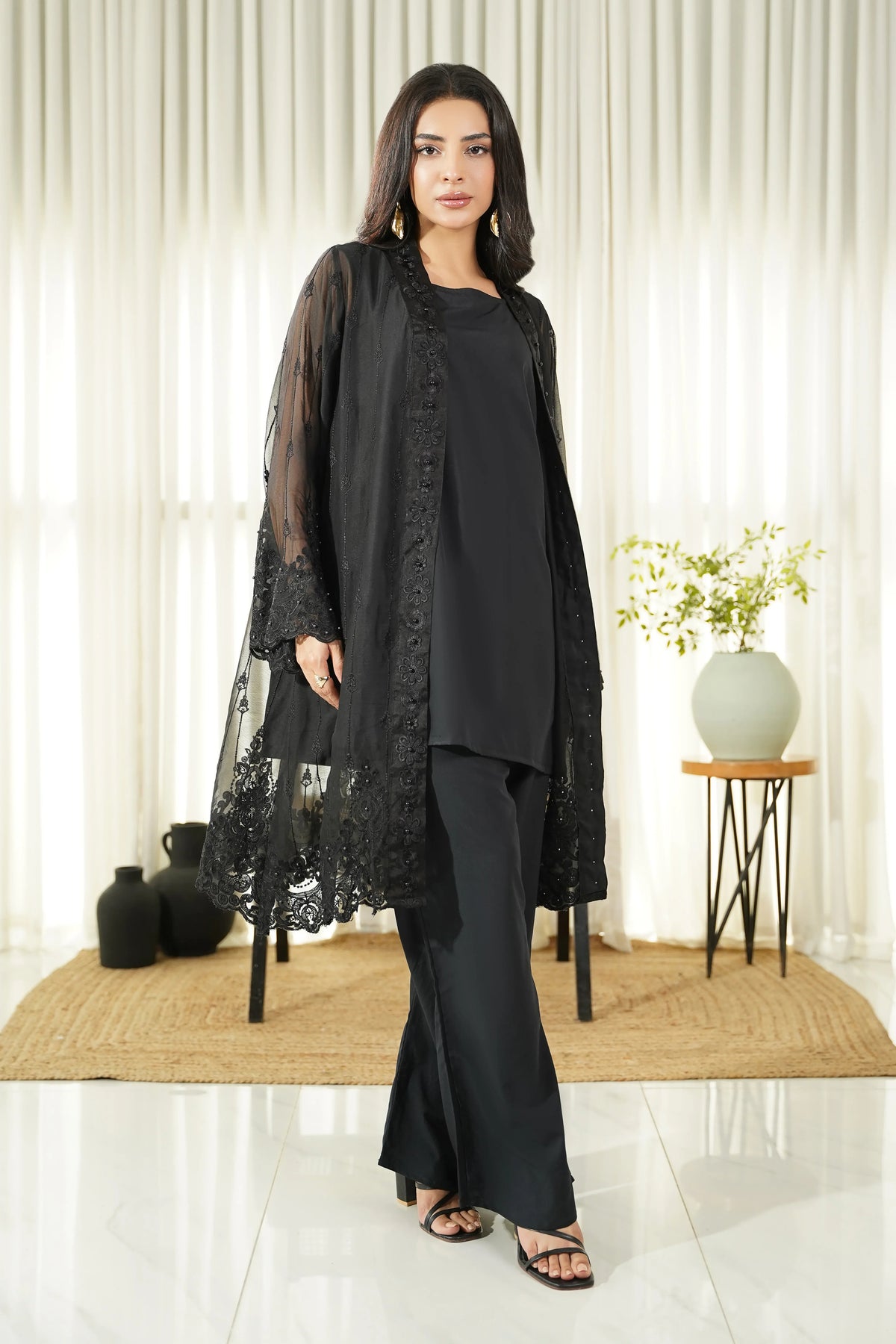 Introducing our elegant black embroidered Coat. This mid-length Coat features intricate embroidery and is made from high-quality fabric for comfort and style.