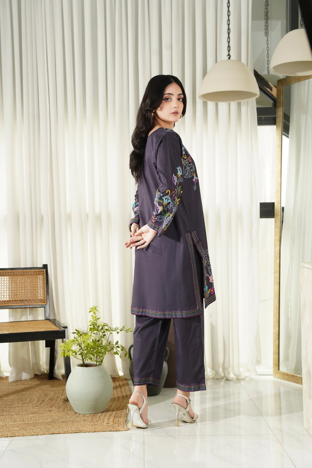 This article consists of a solid 2-piece set with an intricate embroidery detail touch on the shirt. The outfit consists of a long-length style shirt and fitted pants.