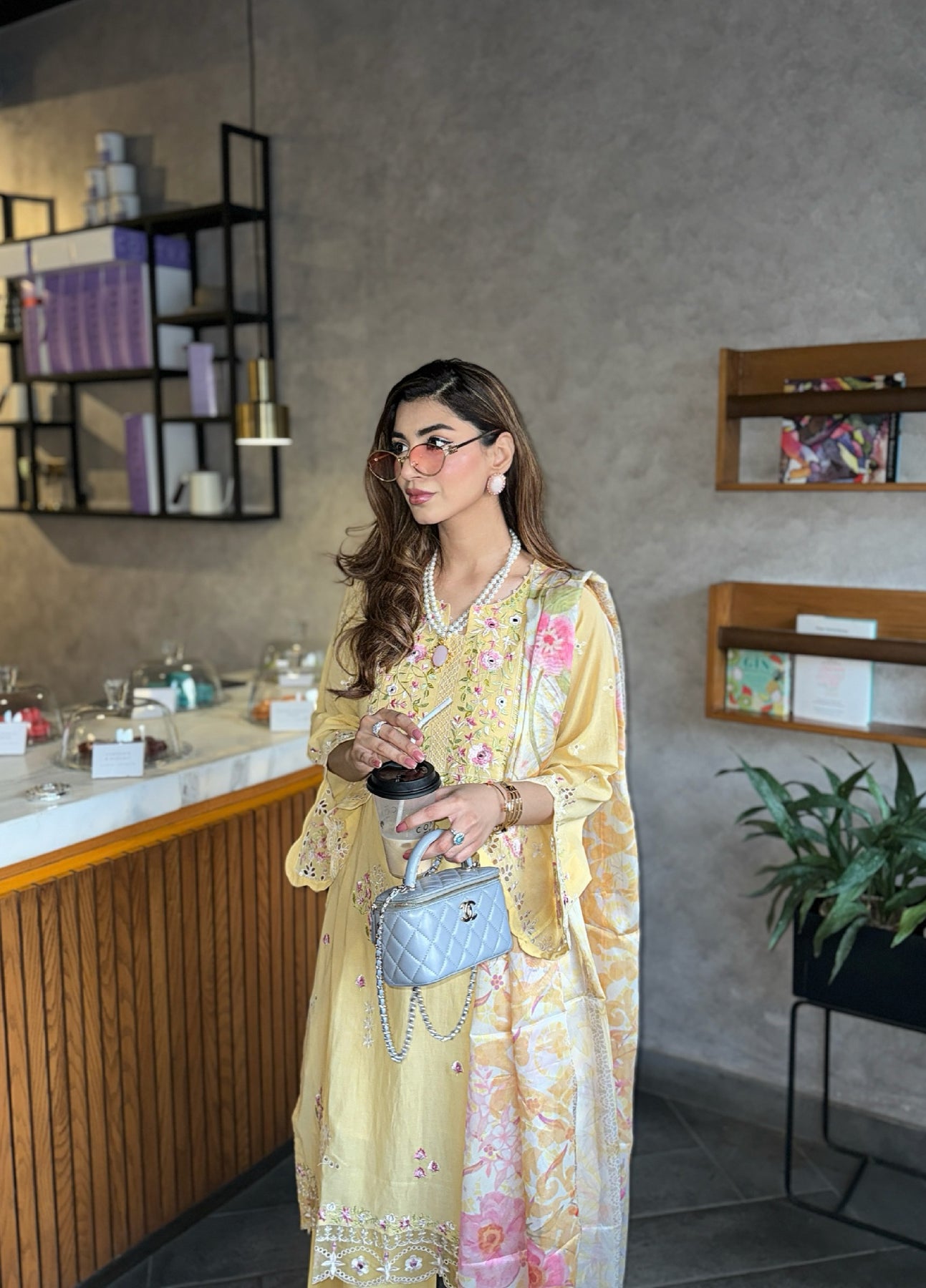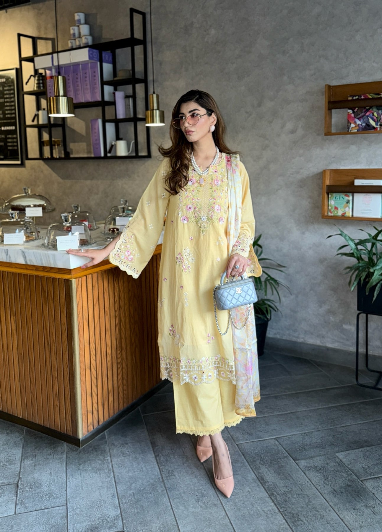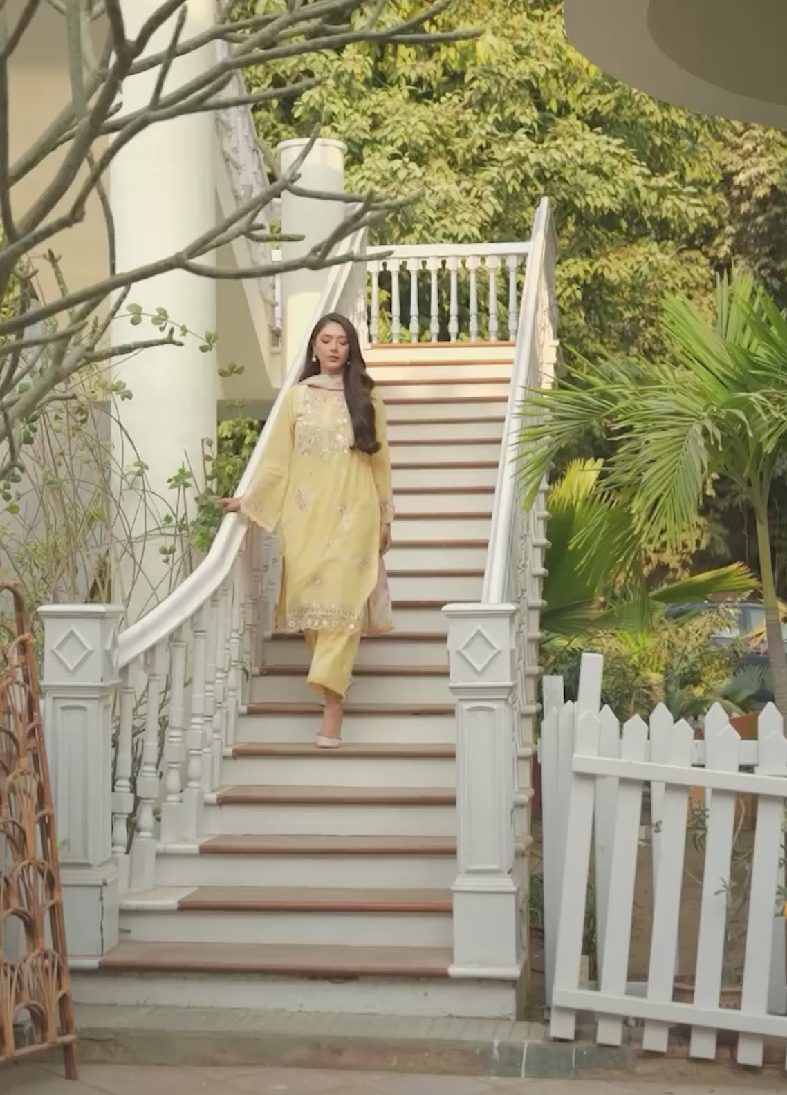 Designed on soft voile, this two-piece ensemble from Dhanak’s Lamhay Collection exudes effortless grace. The pastel yellow kurta is delicately adorned with intricate floral embroidery, enhanced with fine detailing along the neckline and statement sleeves. Paired with a matching trouser, the outfit offers a light, breathable feel - perfect for refined daywear.