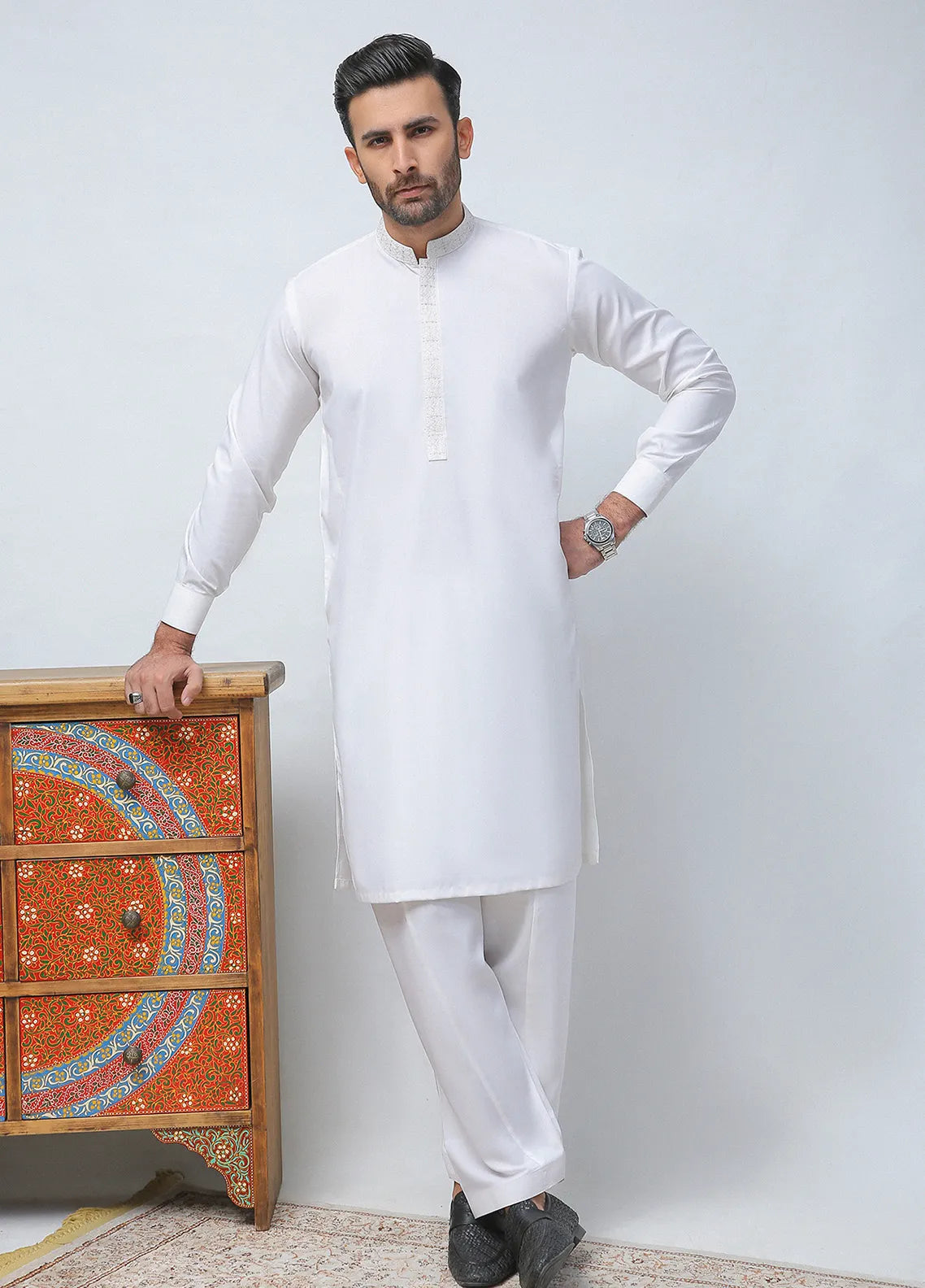 Mens shalwar kameez with embroidered front placket and band collar.