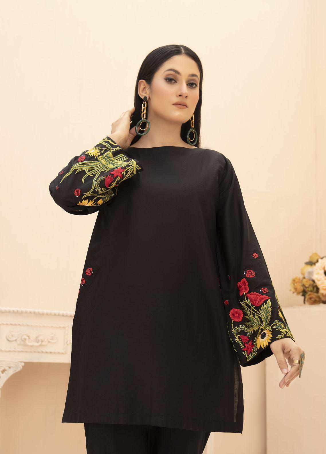 Black Textured Lawn Shirt With Embroidered Sleeves And Embroidered Patches At The Side Seam Of Shirt.