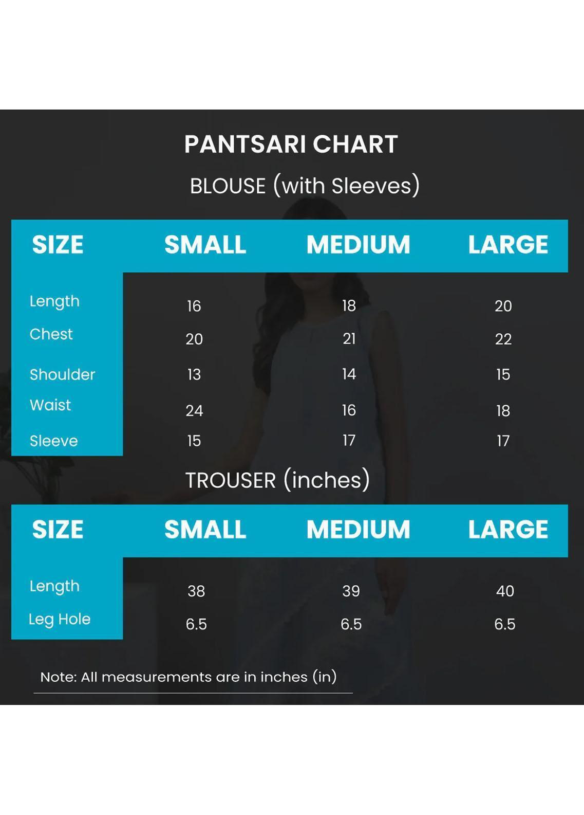 Three piece paint sari. The blouse, a timeless piece features all over sequences in net fabric. Zip enclousre at tha back of the blouse. Also includes trouser and sari in pure silk fabric.