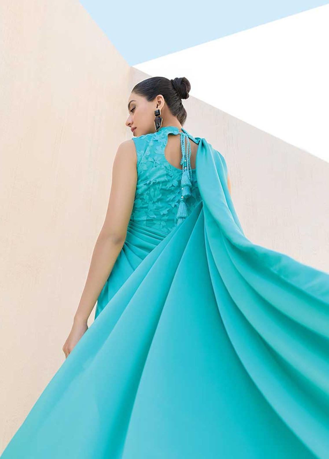 This signature JK pant sari will surely complete your festive wardrobe this spring.the blouse is cut from net fabric, with an elegant tussle dori at back and a floral brooch detail on the front of blouse.this stunning emerald green pant sari is a must have.it also includes trouser and sari in pure silk fabric.model is wearing small size;model height is 5.8".