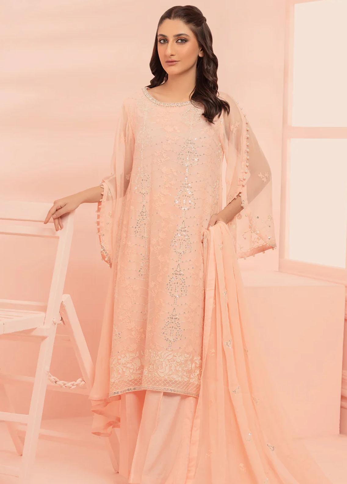 Ready to wear chiffon tunic in Pastel Peach shade ornamented with crystal hand embellishment with sequins and thread work is used on the embroidery for an elegant look