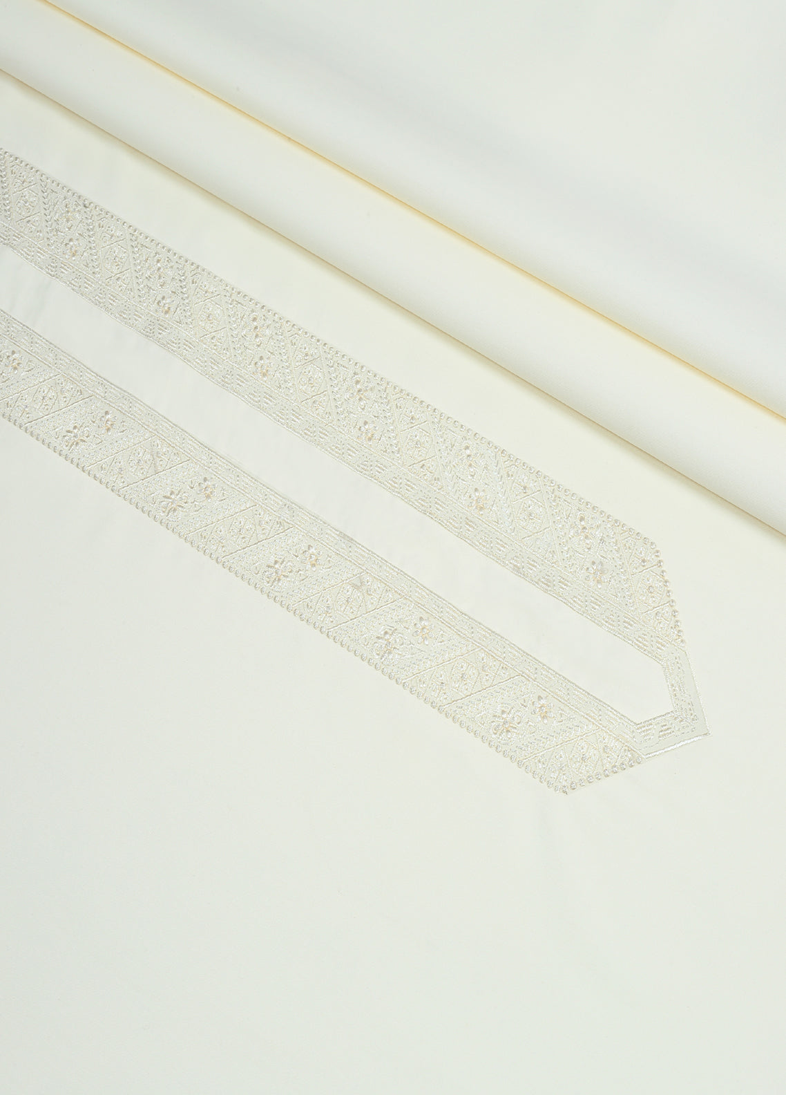 Product Category: Men Unstitch Self Thread Run-Stitch Neckline Embroidered Kameez Shalwar with Contrast Colors & Signature Pattern Embroidery Design.