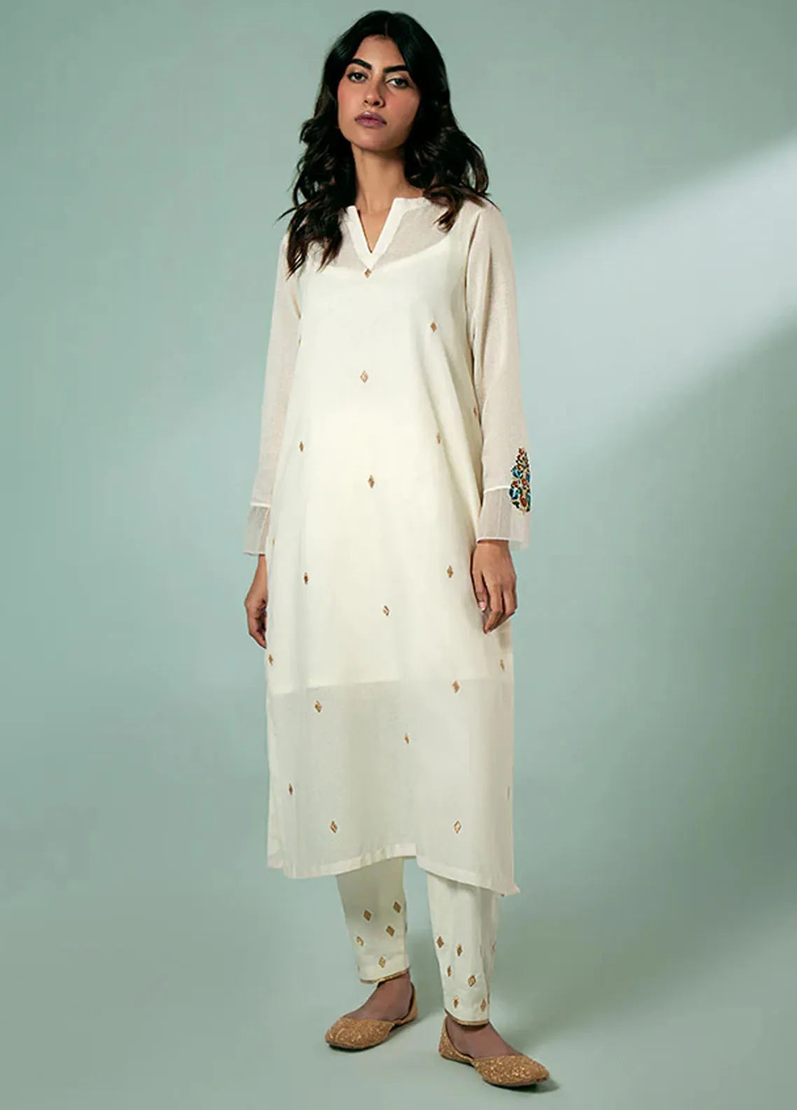 Fozia Khalid Pret Casual Karandi Kurti Ivory Sprinkled