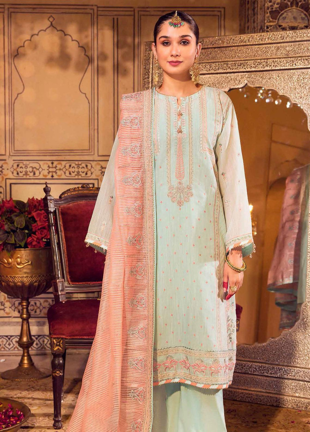 Embroidered Stripe Dupatta Embroidered Paper Cotton Shirt with Embroidered Borders Dyed Inner and Trouser