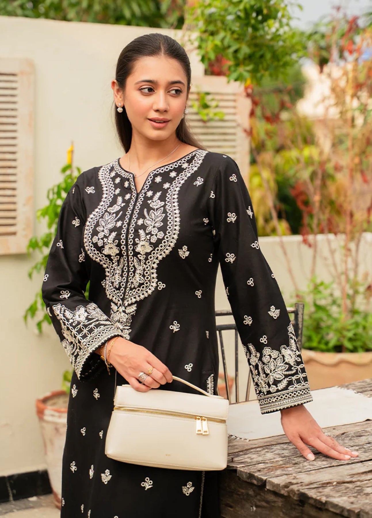 Moonlit Noir is a timeless two-piece set in a classic black base, crafted with elegance and detail. The lawn shirt features intricate embroidery, enhanced with embroidered lawn borders on the front and sleeves for a graceful finish. Paired with a comfortable cotton trouser, this ensemble strikes the perfect balance between sophistication and everyday ease, making it a versatile addition to your wardrobe.