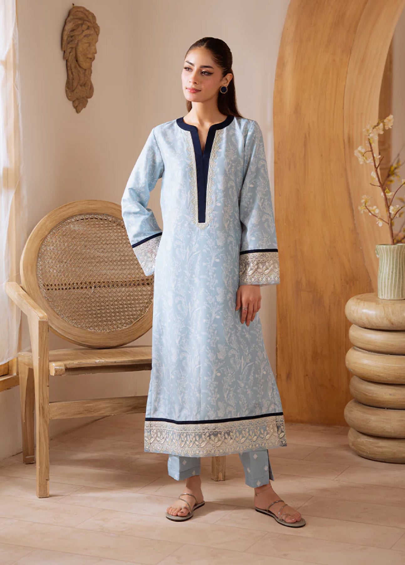 Elyra is a refined two-piece set crafted in breathable poly lawn, featuring an airy blue base adorned with a delicate white floral pattern. The neckline is elevated with a striking black strip accent, complemented by subtle off-white embroidery for a graceful finish. Black strip detailing on the sleeves and daman pairs beautifully with embroidered organza borders, adding an extra layer of sophistication. A perfect blend of freshness and elegance, Elyra is an ideal choice for chic everyday wear.