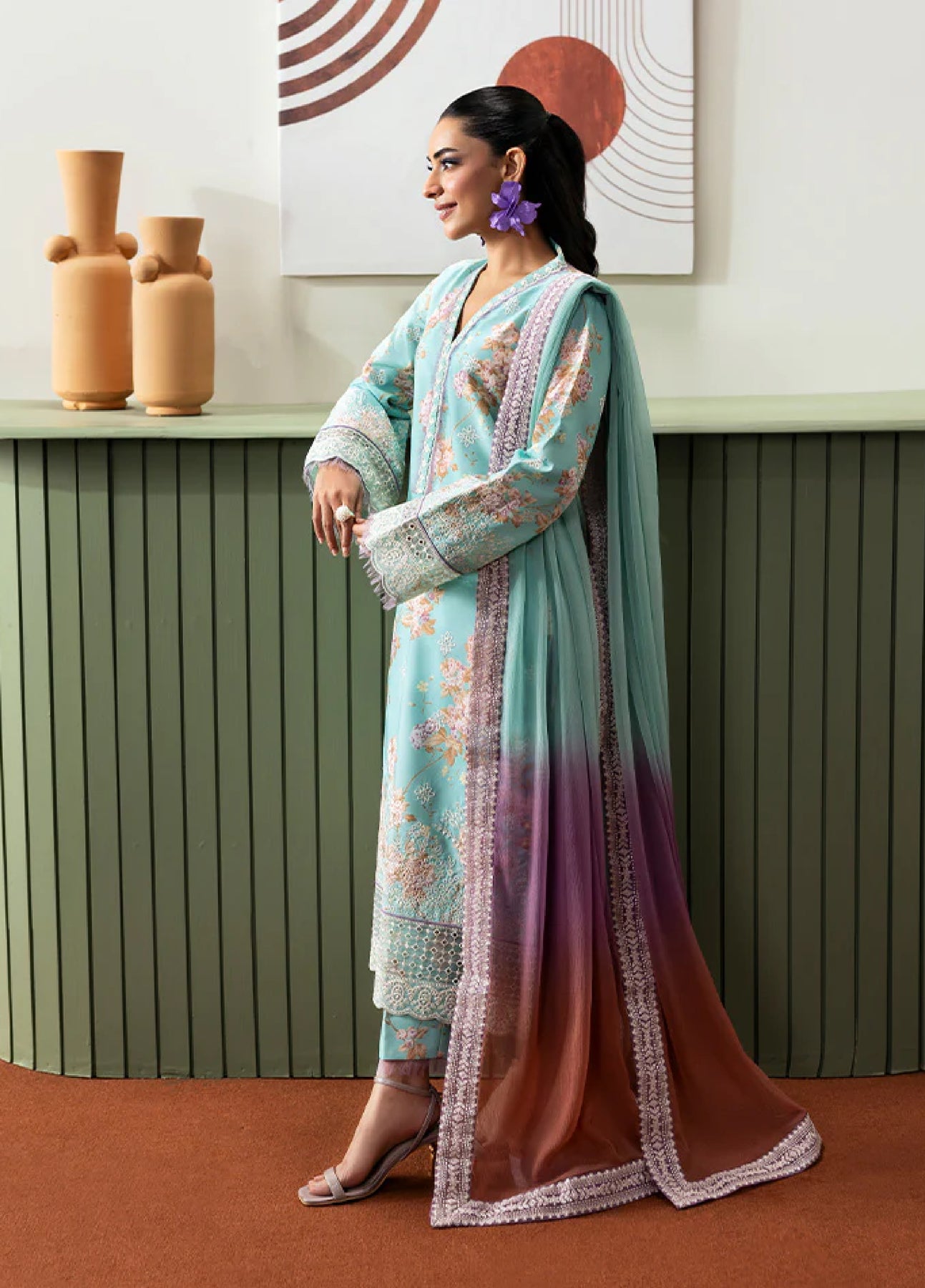 A timeless blend of tradition and artistry, Celia brings elegance to life with its all-over embroidered and printed poly lawn shirt, radiating intricate charm. Delicate chikankari embroidered organza borders grace the sleeves and front, beautifully paired with an embroidered organza neckline to elevate the ensemble? finesse. The look is completed with a striking tri-tone hand-dyed chiffon dupatta finished with four-sided organza borders, infusing movement, color, and sophistication into every wear. A must-have statement for the season.