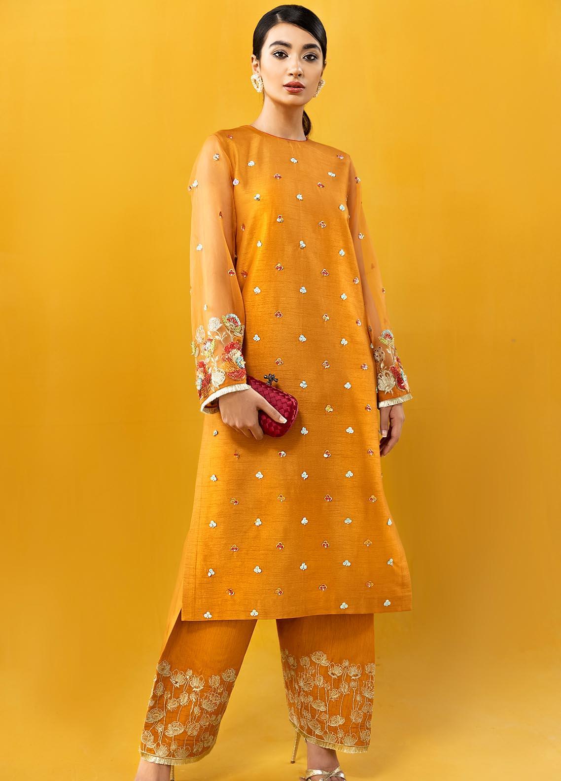 Floral Fantasy, outfit that speaks for itself is a set made on Raw Silk. Statement outfit has Organza sleeves with embroidered and embellished 3-D flowers in hues of red and orange. The front is embellished with hand made boti. Pair it with traditional embroidered shalwar to complete the looks