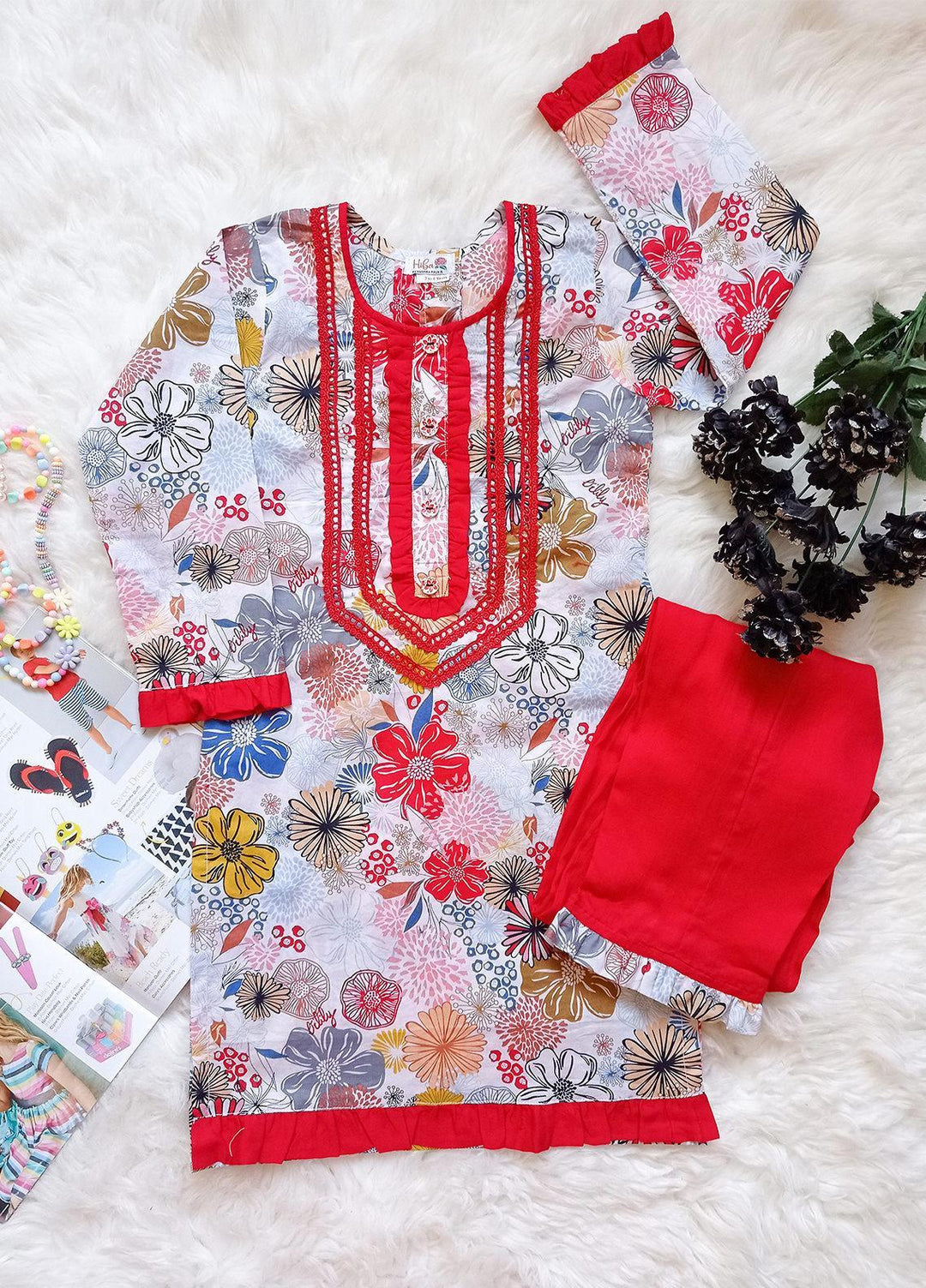 Hiba Clothing Chikankari Fancy Girls 2 Piece Suit - HME-002 RED & WHITE