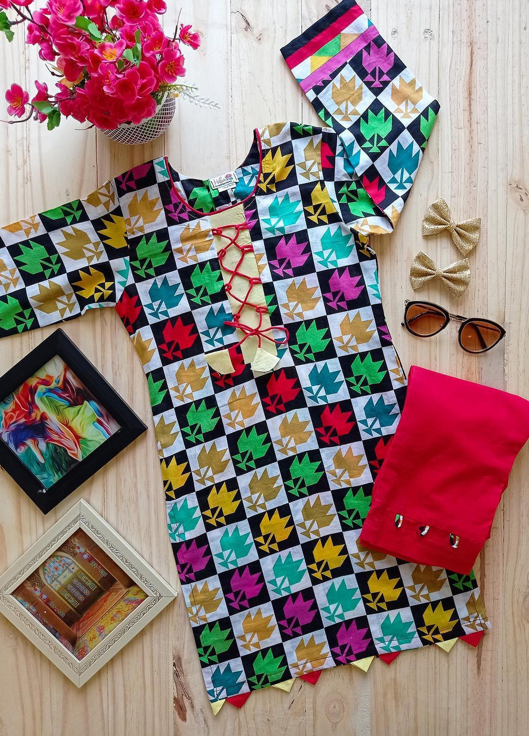 Hiba Clothing Linen Girls 2 Piece Suit - HPW-002 NEON CHECK