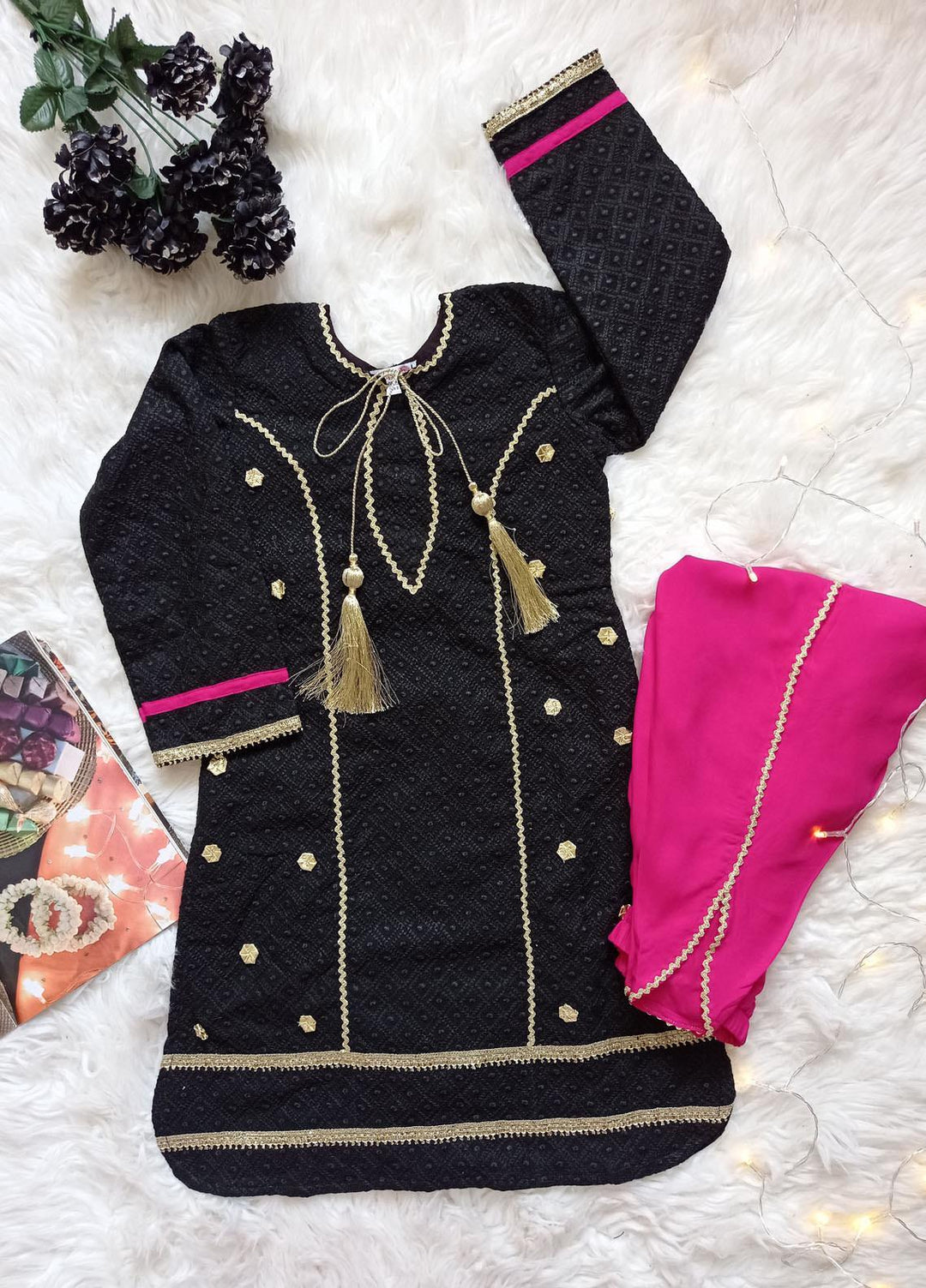 Hiba Clothing Chikankari Fancy 2 Piece Suit for Girls - HEC-005 Black & Gold