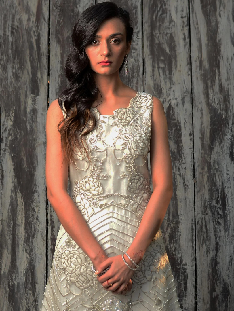 Hues Atelier Pret Embroidered Organza Gown HA23LF White Loom