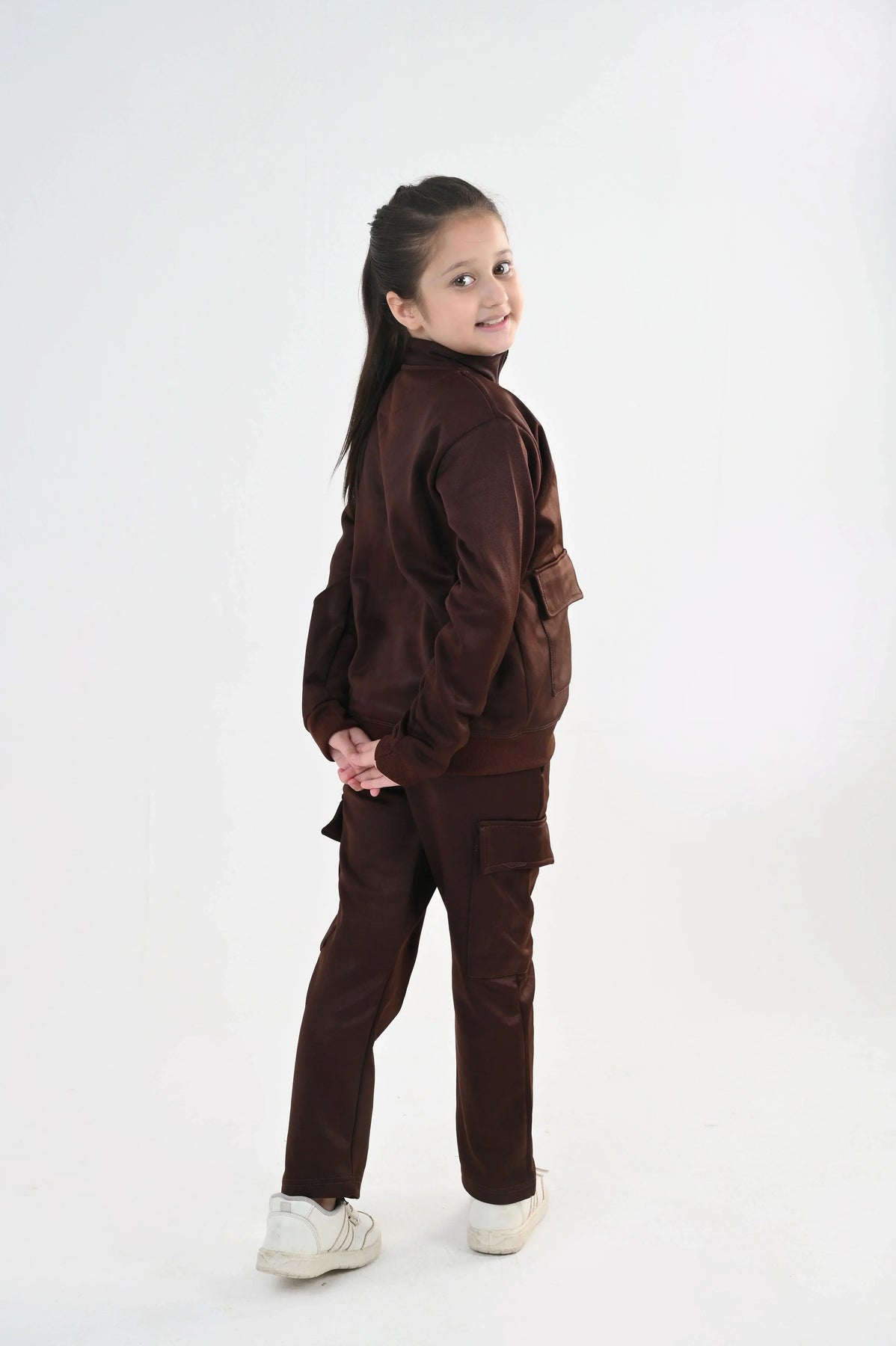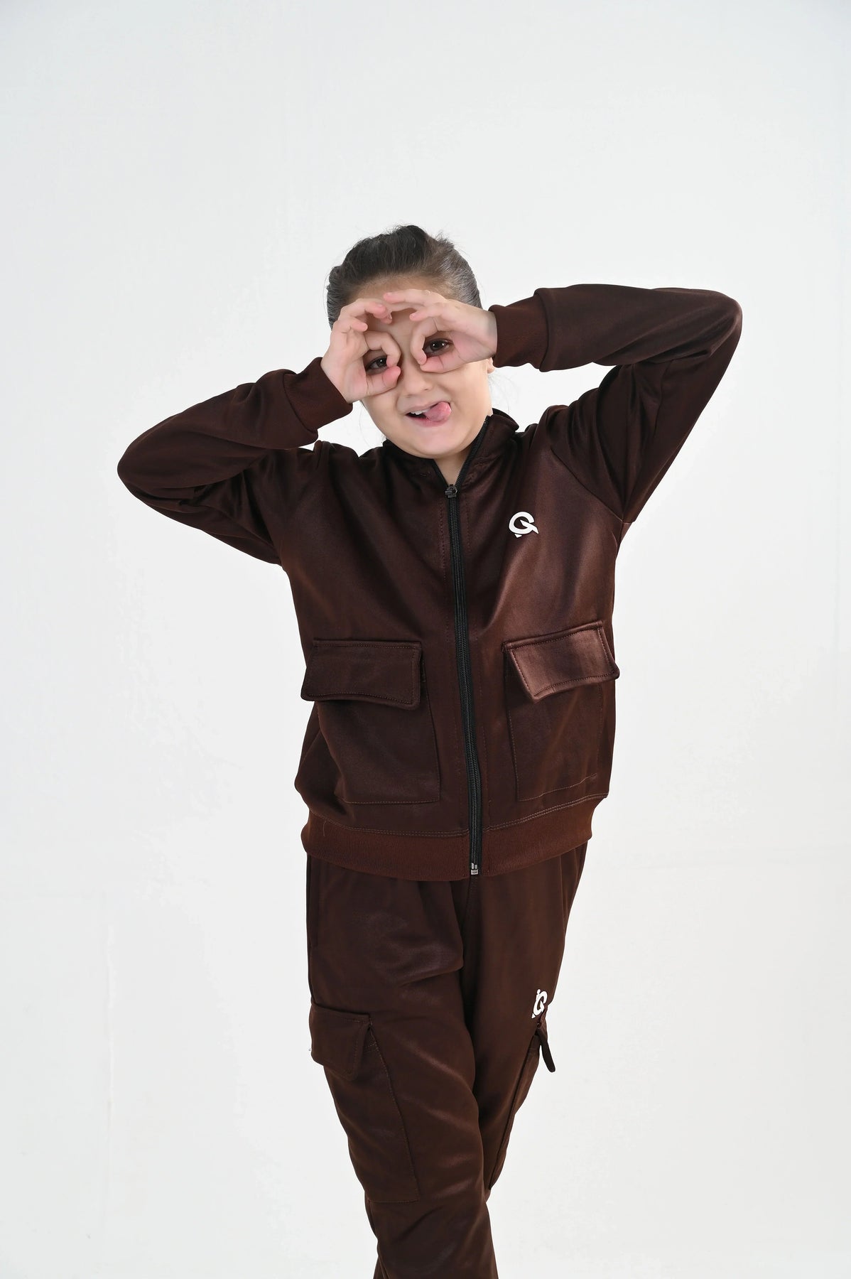 Introducing the Cocoa Cargo Charm Tracksuit - Unisex Kids, a trendy and functional winter outfit perfect for your little ones! Made from warm polyester fleece fabric, this tracksuit keeps kids comfortable and cozy during chilly days. The rich cocoa color adds a touch of charm, while the cargo-style pockets on both the jacket and pants provide extra storage for small essentials or a place to warm up their hands. Designed for both boys and girls, this stylish tracksuit combines practicality with a cool, relaxed look, making it ideal for outdoor adventures, school, or casual lounging!