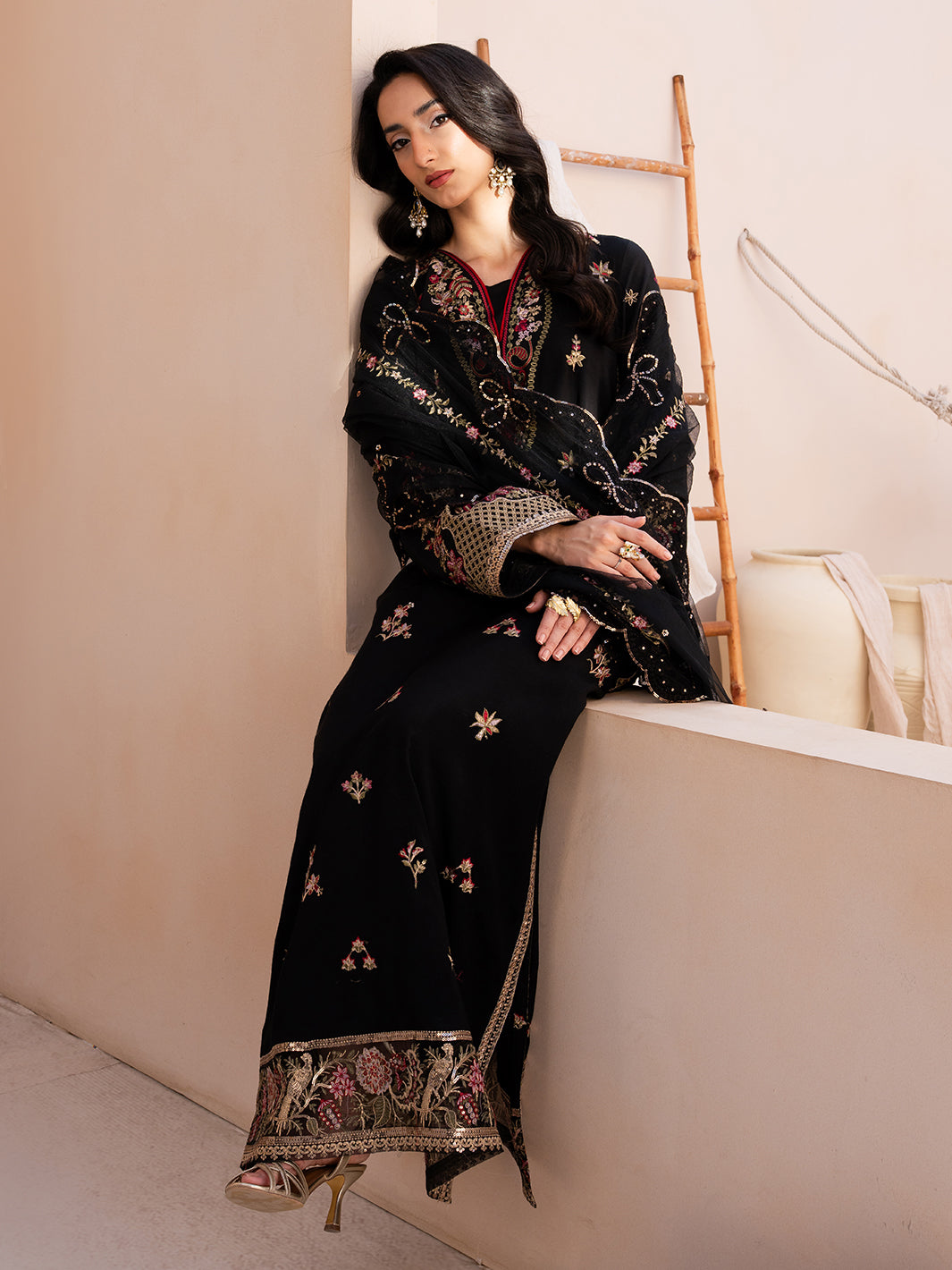 Marive from the Le Tresor Collection is a masterpiece of intricate craftsmanship and refined elegance. The ensemble features an embroidered raw silk front, sleeves and back accented with embroidered organza borders sleeve patches and slit patti. Embroidered organza detailing on the pants border complements the plain raw silk pants while the embroidered net dupatta completes the look with a touch of sophistication