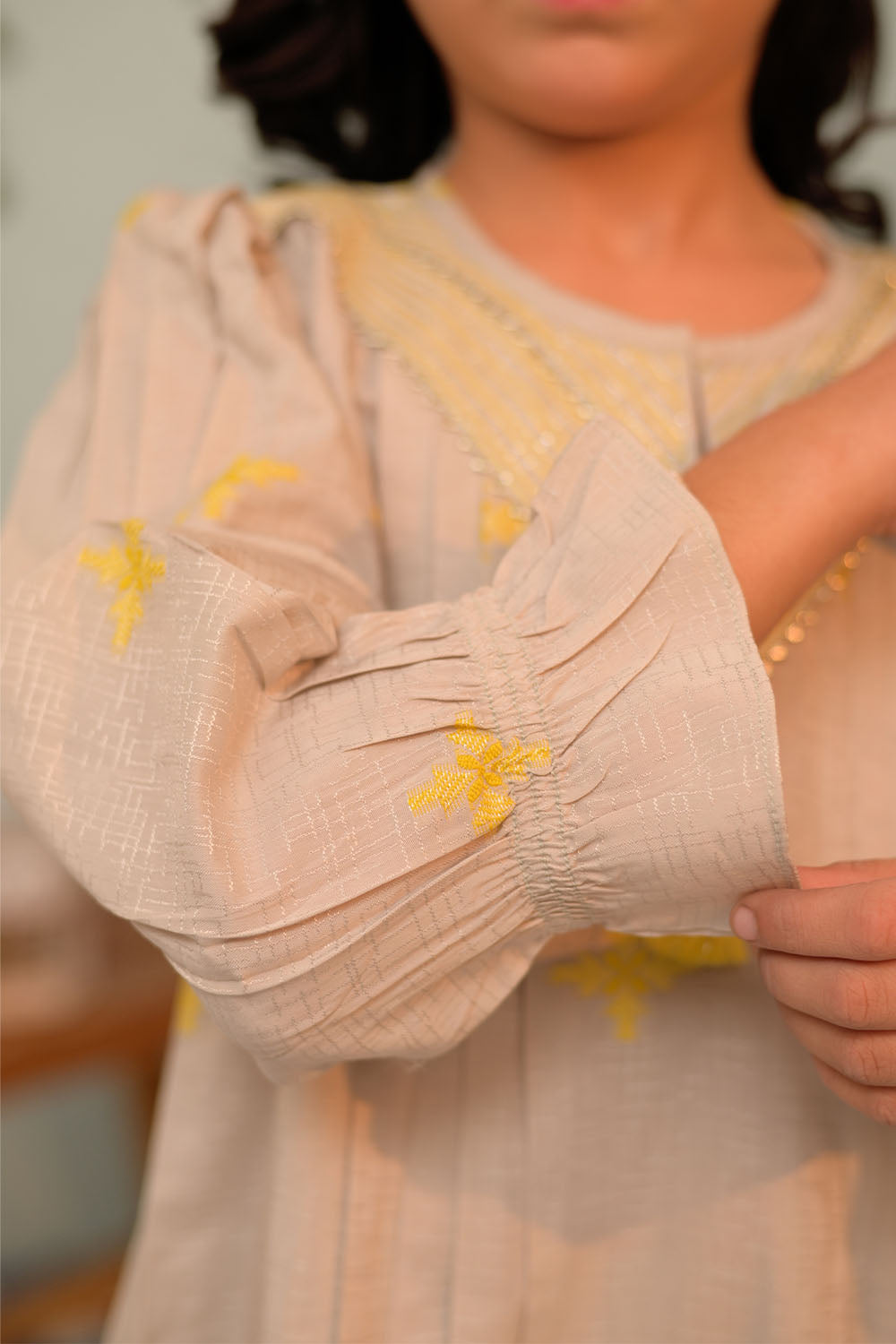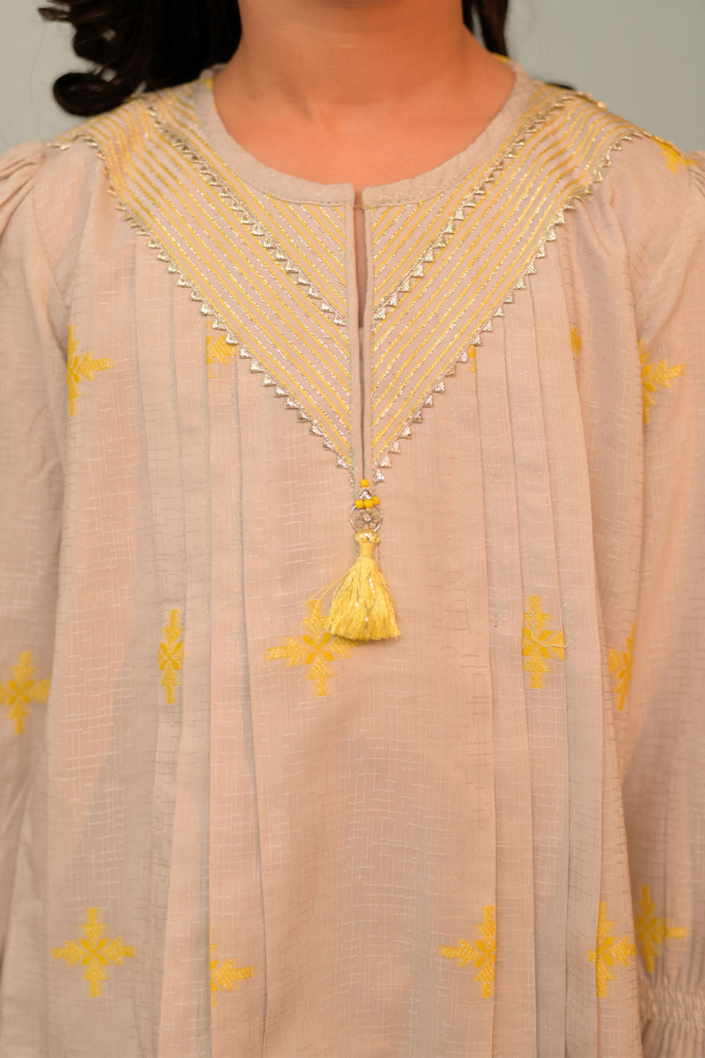 Stylish A-line pleated shirt. Having fancy embroidery and lace. Embellsihed with beads and tassel. Paired with gharara pants and dupatta.