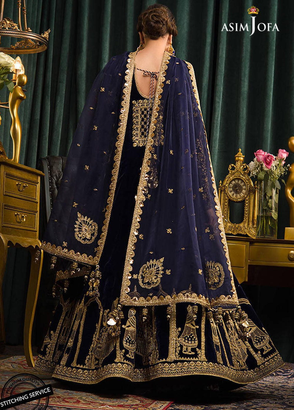 An Ode To The Mughal Era This Design Captures Its Grandeur In A Unique Way. An Embroidered Procession Marches Along The Hemline Of The Angarkha Topped With Heavily Embroidered Sleeves On A Midnight Blue Velvet Base. It Comes With Dyed Pants And Tastefully Embroidered Organza Dupatta.