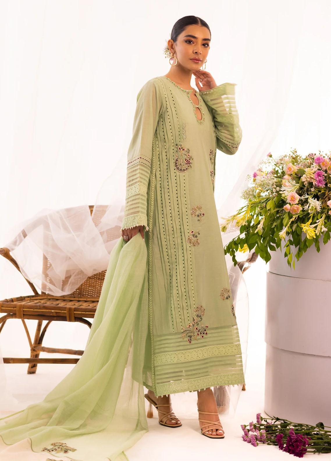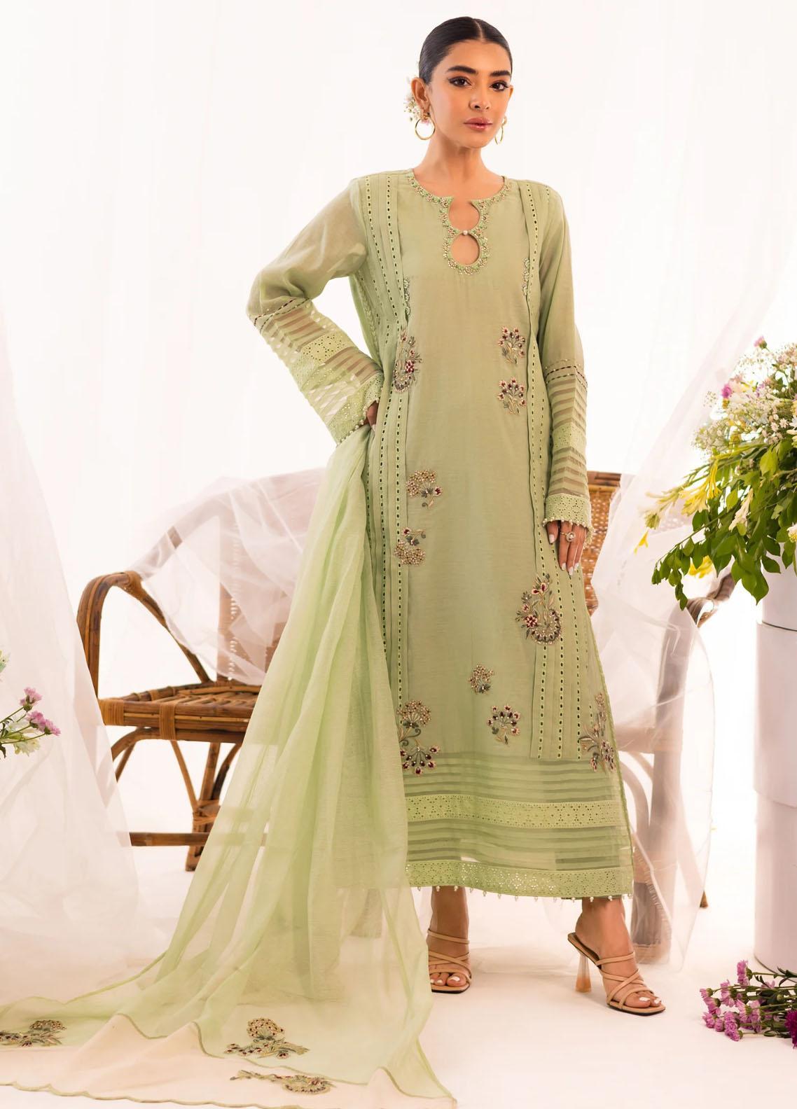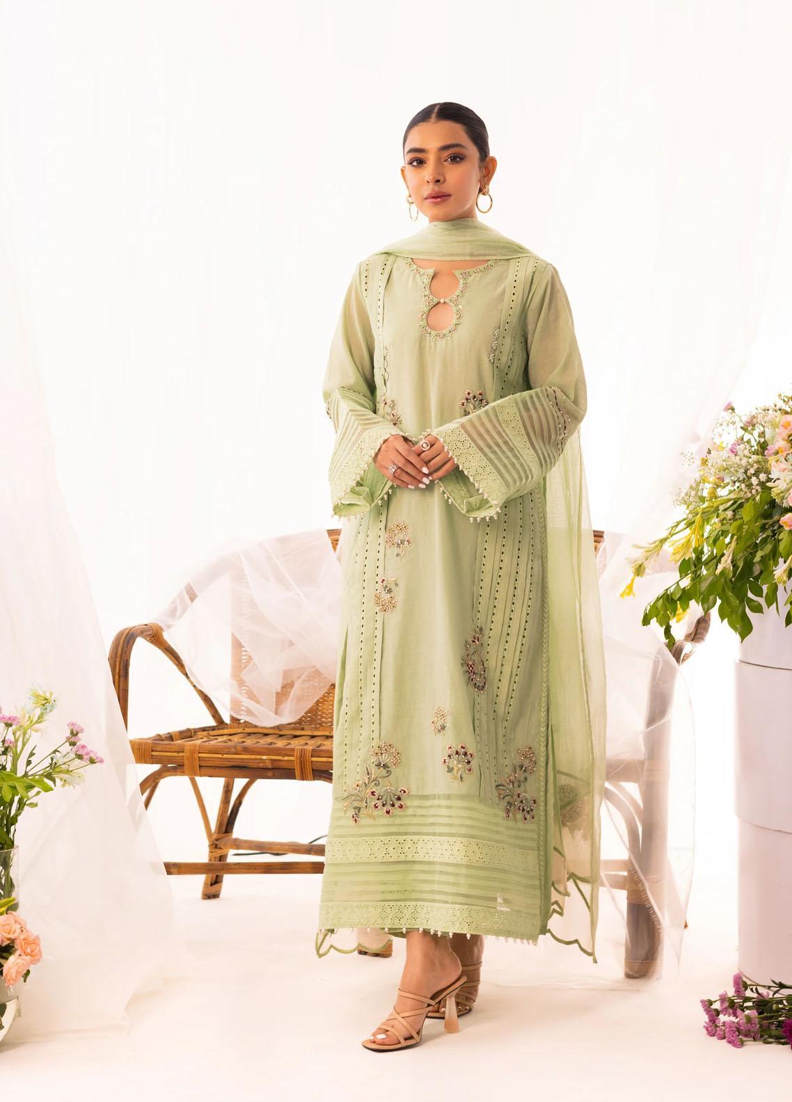 Lily, a fresh attire in the shades of apple mint canvas features appliqued motifs all over the shirt in the shades of maroon, mint and fresh beige, featuring fine taankas over the sleeves, adding an imp of allure. Paired with a light as air two tonal dupatta adorned with embroidered motifs and lace finished pants adding the ultra feminine twist