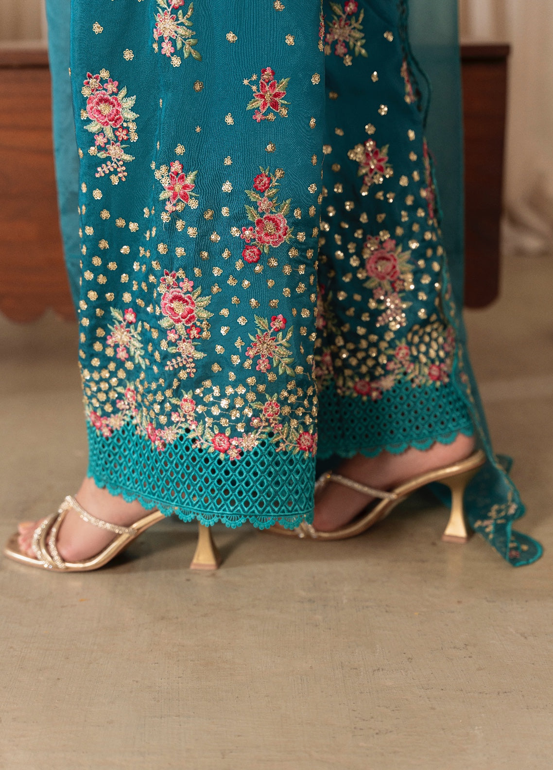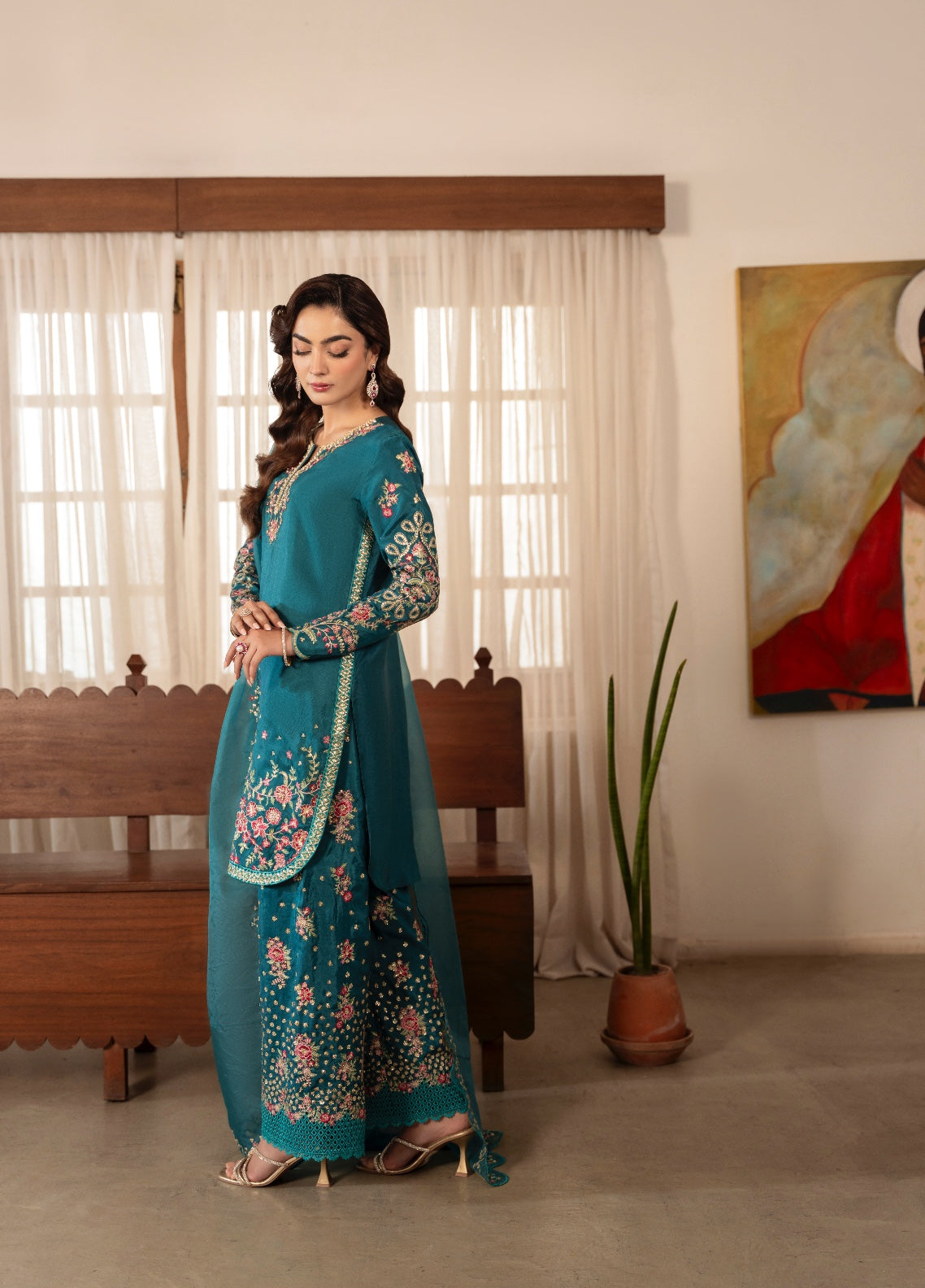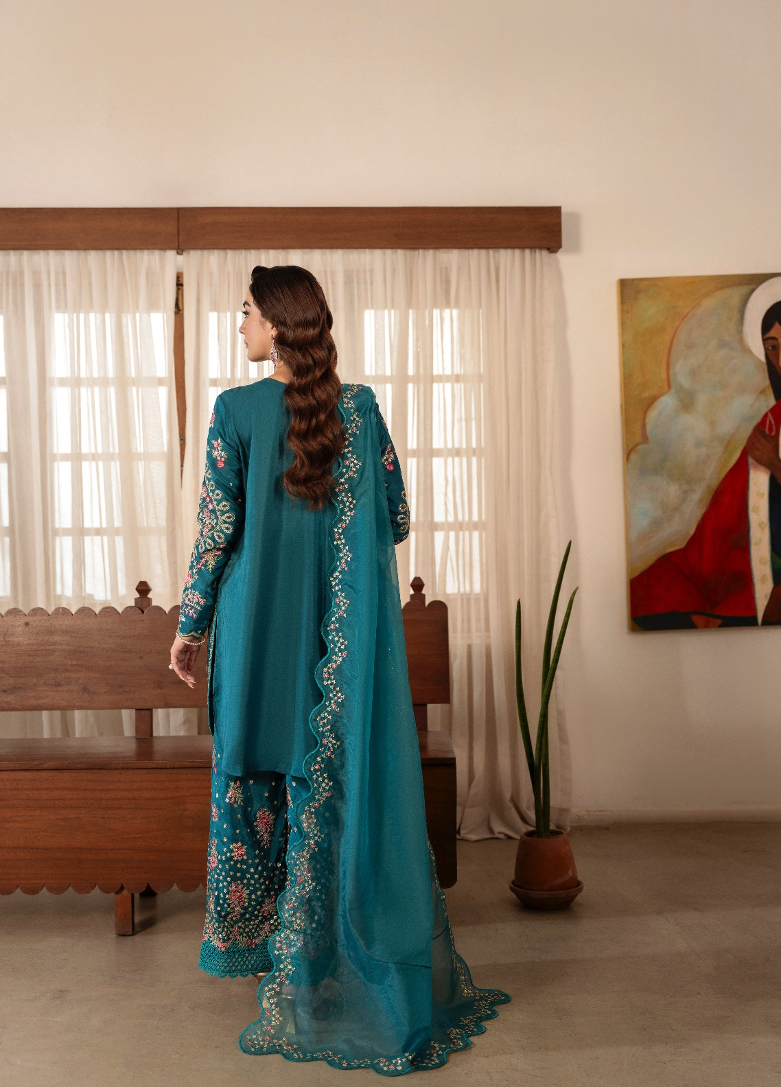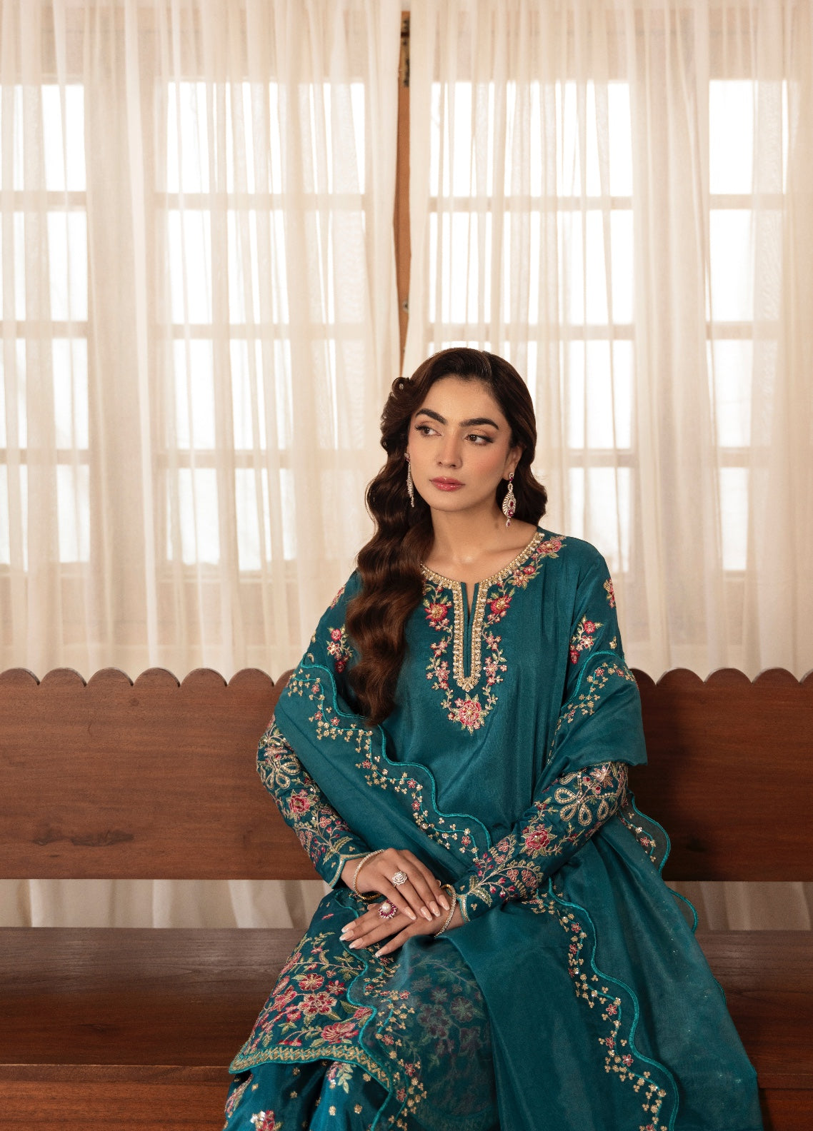 ZOE is crafted from pure ramen silk in a serene sea green hue, radiating fresh elegance. The shirt features a floral embroidered and hand-embellished neckline, with floral and sequin embroidery adorning the sleeves and hem, while matching pants are accented with colorful floral bunches, and cutwork and lace detailing at the hem. Completed with an organza dupatta featuring scalloped, sequin-embroidered borders β ZOE is a graceful ensemble that brings timeless charm and vibrant sophistication.
