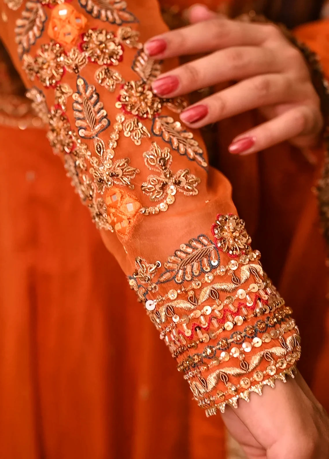 Frock: An epitome of elegance and craftsmanship, this heavily embroidered organza frock is adorned with intricate shesha and adda work, exuding timeless charm. The beautifully detailed bodice features rich hand embellishments, while the flare is accentuated with a striking 6" embroidered bunch, adding depth and grandeur to the silhouette.