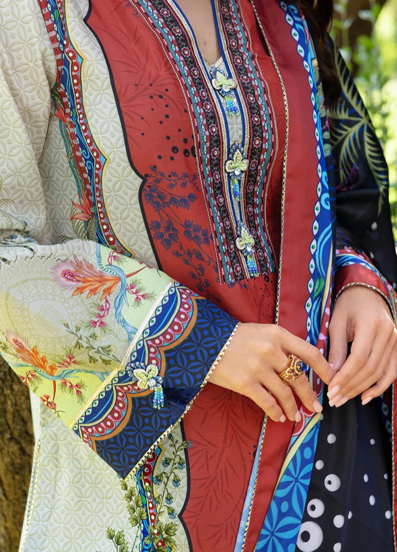 • Hand-embellished neckline buttons