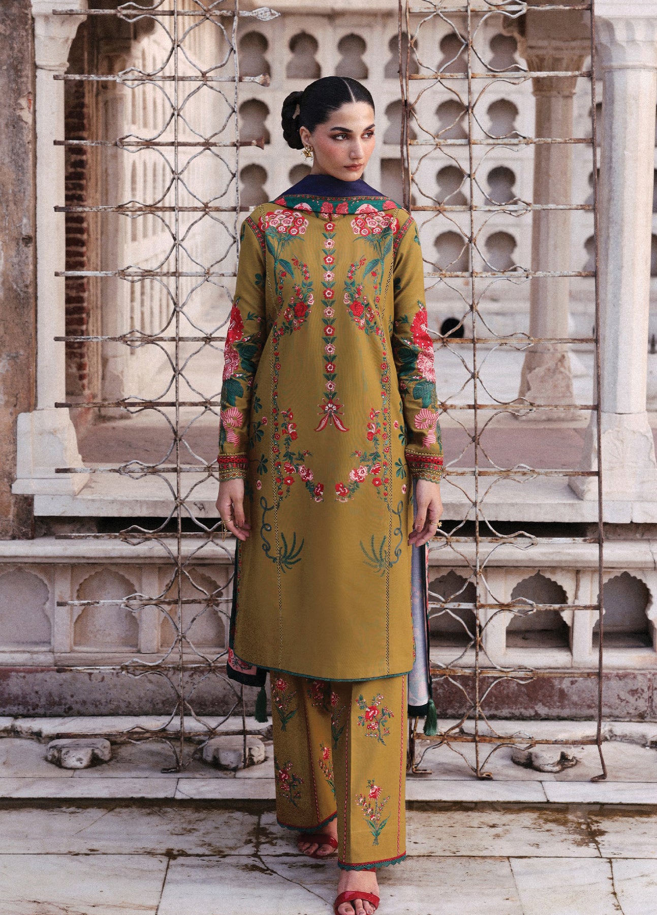 Description: This outfit features a mustard-colored shirt richly embroidered with multicolored floral patterns that extend across the front and sleeves, adding vibrant pops of red, pink, and green. The matching trousers carry coordinated floral embroidery, creating a seamless and elegant ensemble. A printed wool shawl completes the outfit, providing both warmth and a graceful, cultural accent.