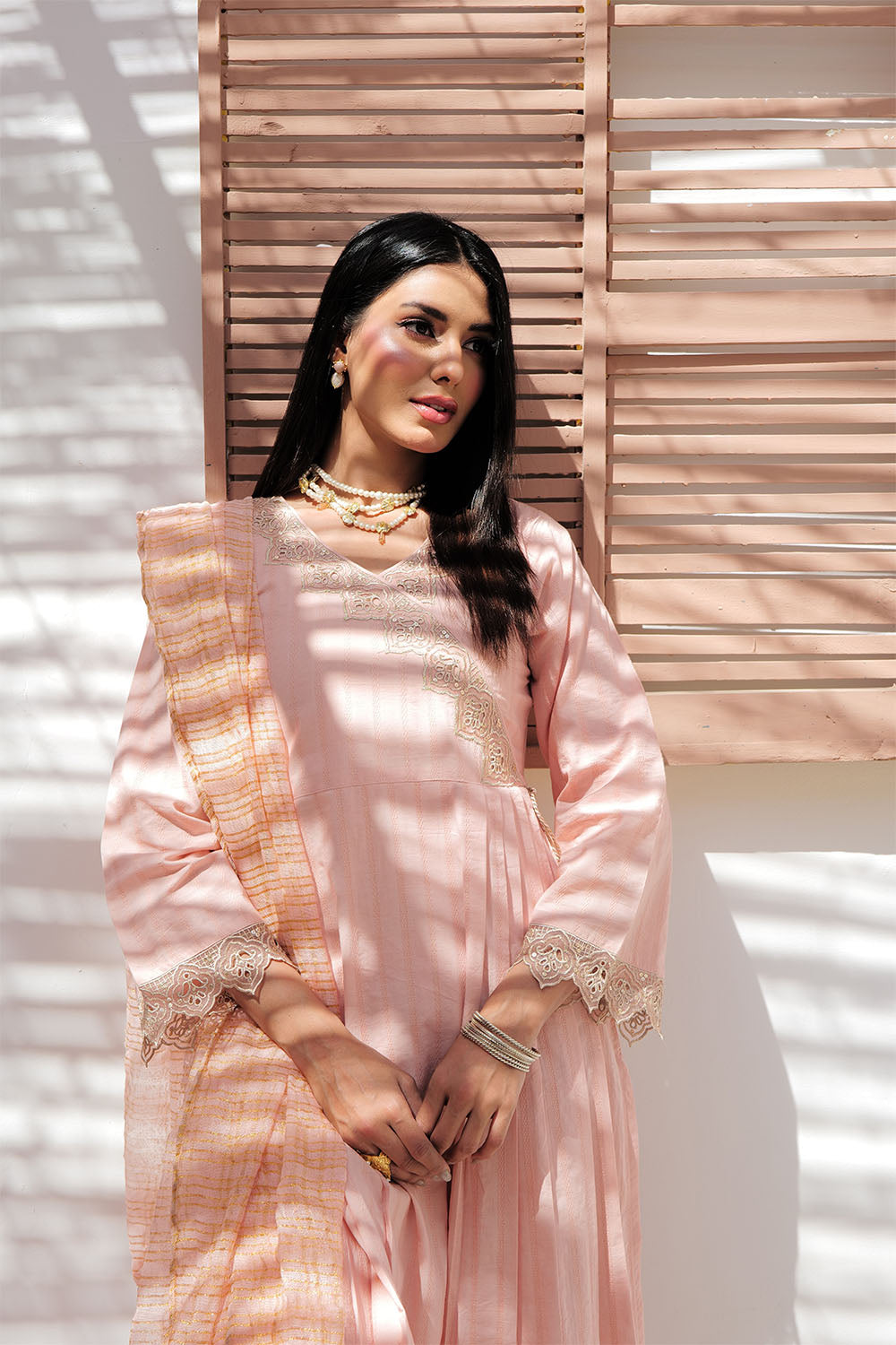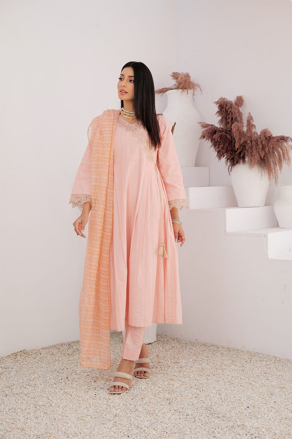 Angharka style shirt, finished with fancy lace embroidery and tassel. Paired with straight pants and dupatta.