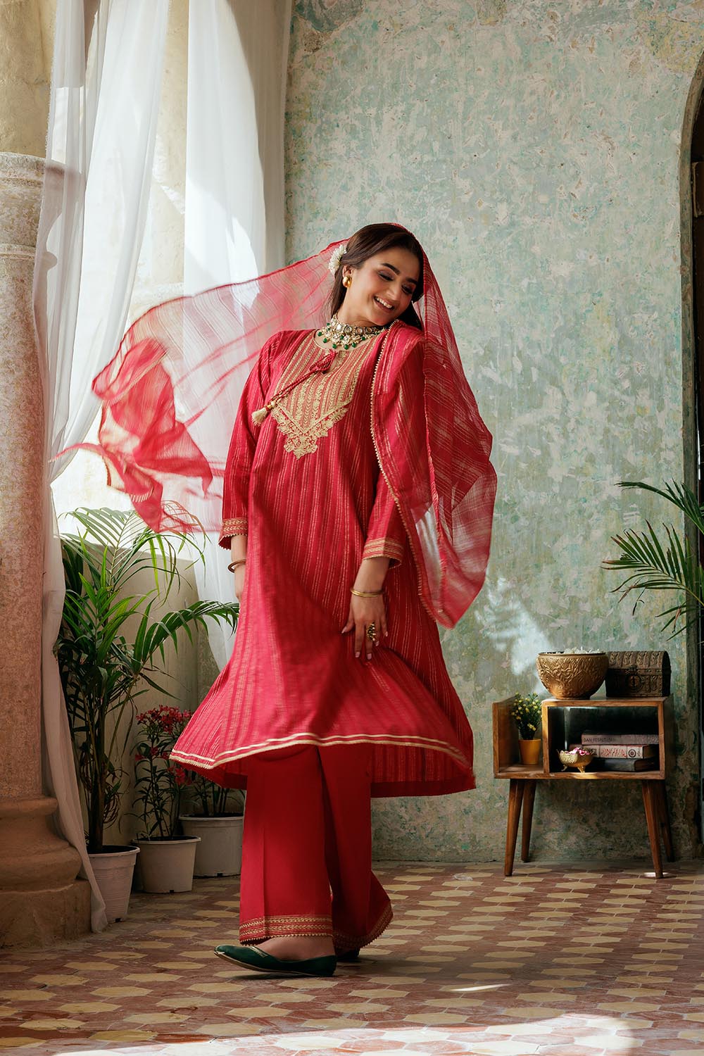 "A line panelled shirt, with contrasting fancy embroidery and lace. Paired with straight pants and fancy dupatta.