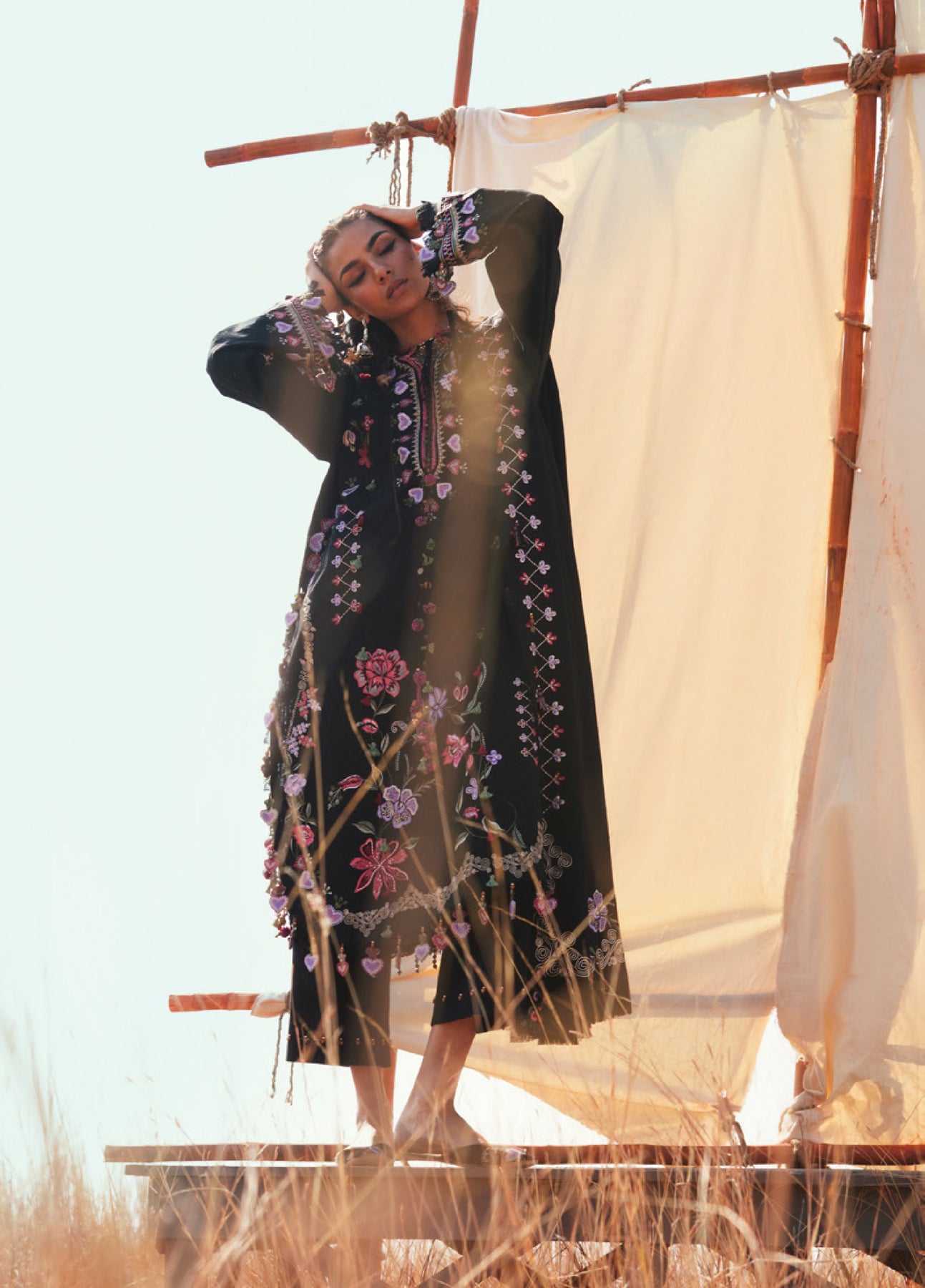 Sehyr — a wild midnight bloom brought to life on a jacquard khaddar shirt and trouser, draped in a soft woolen shawl. Untamed florals and storm-lit stitches ripple across the fabric, echoing the fierce, free heartbeat of winter. Moody, bold, and effortlessly wild — Sehyr is for the woman who moves through winter like a storm of style.