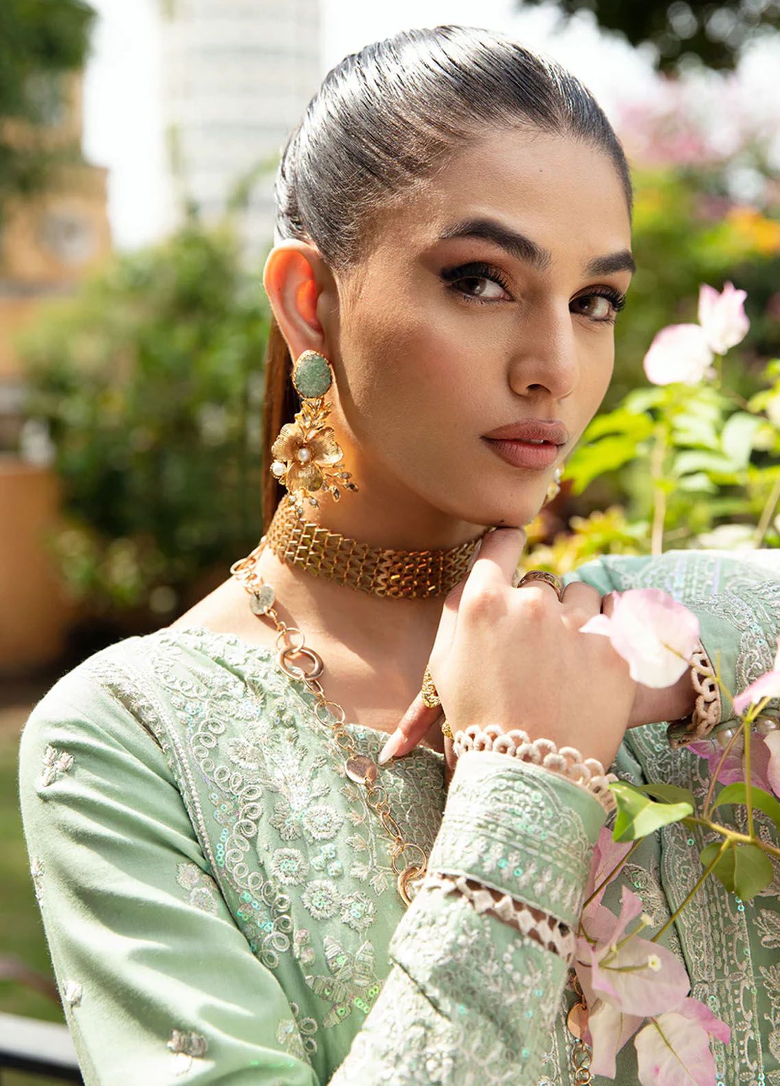 • Embroidered and sequined organza jaal for front neckline