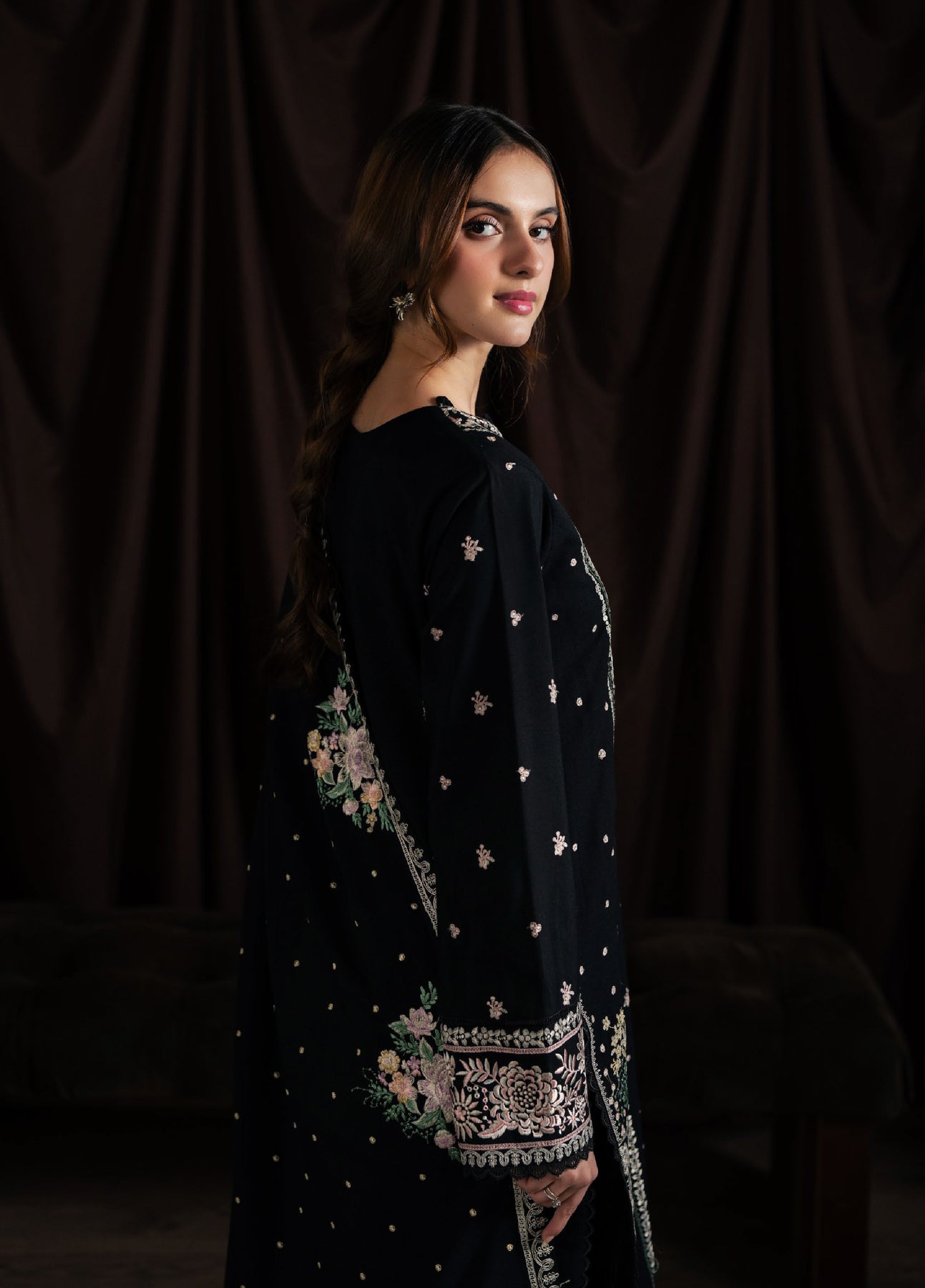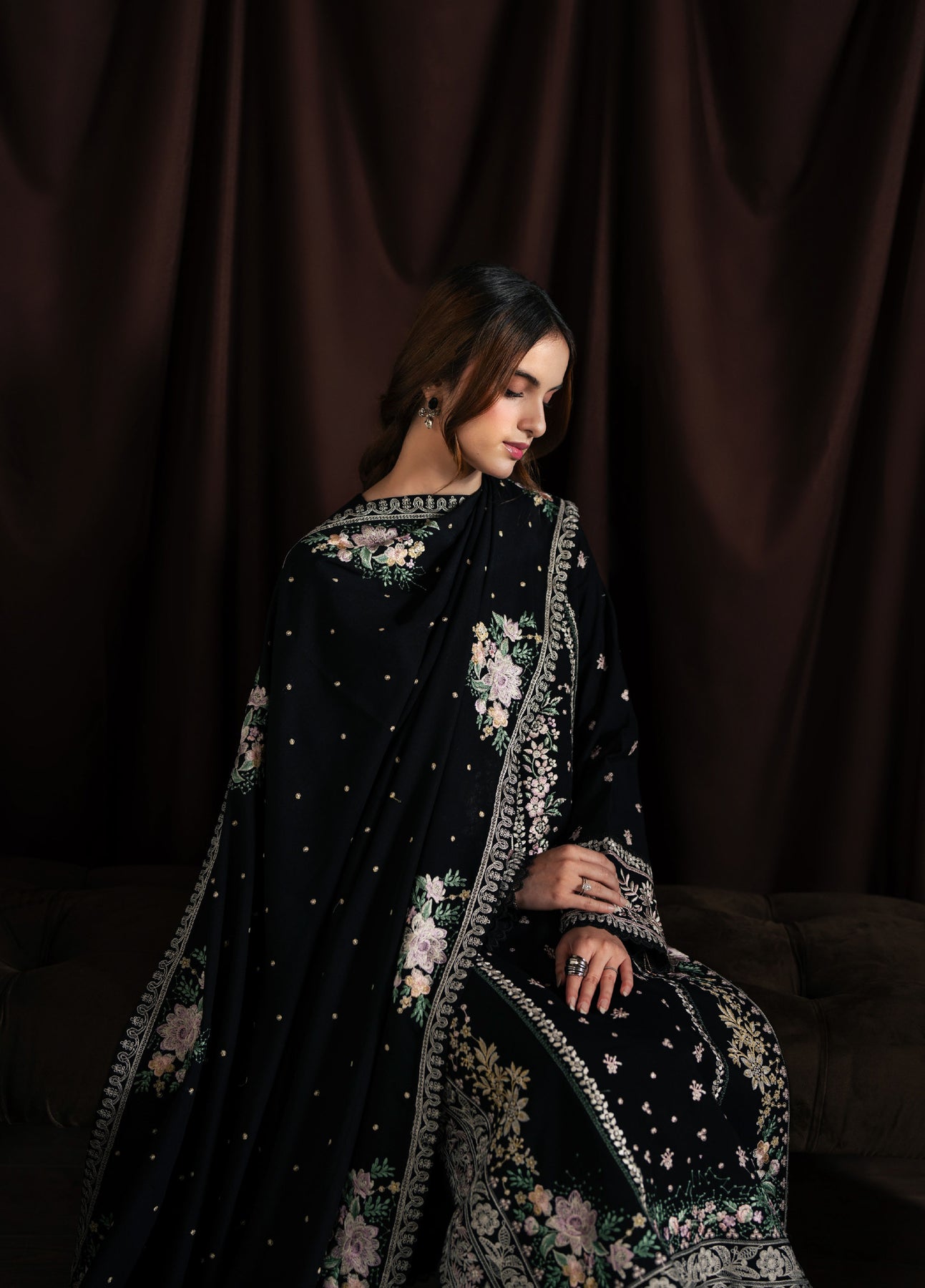 Born of midnight whispers, VELAYNE unfolds in hues of black and moonlight β embroidery blooms across the front and sleeves in soft florals and whites, while a karandi shawl, adorned on all four sides, frames the look in quiet splendor. A reverie of depth, grace, and ethereal allure.