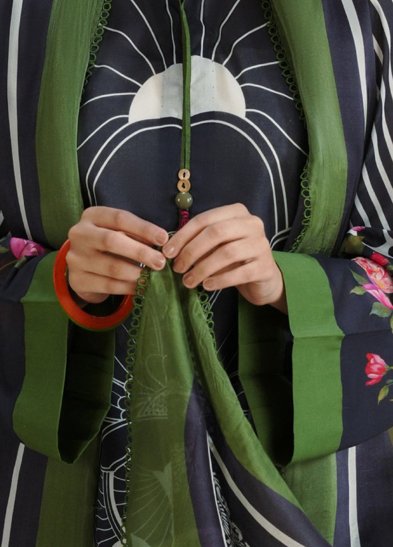 The dupatta is printed in midnight blue with paisley motifs and a moss green border. The shirt features midnight blue and white art nouveau inspired prints. The trouser is finished in solid midnight blue.