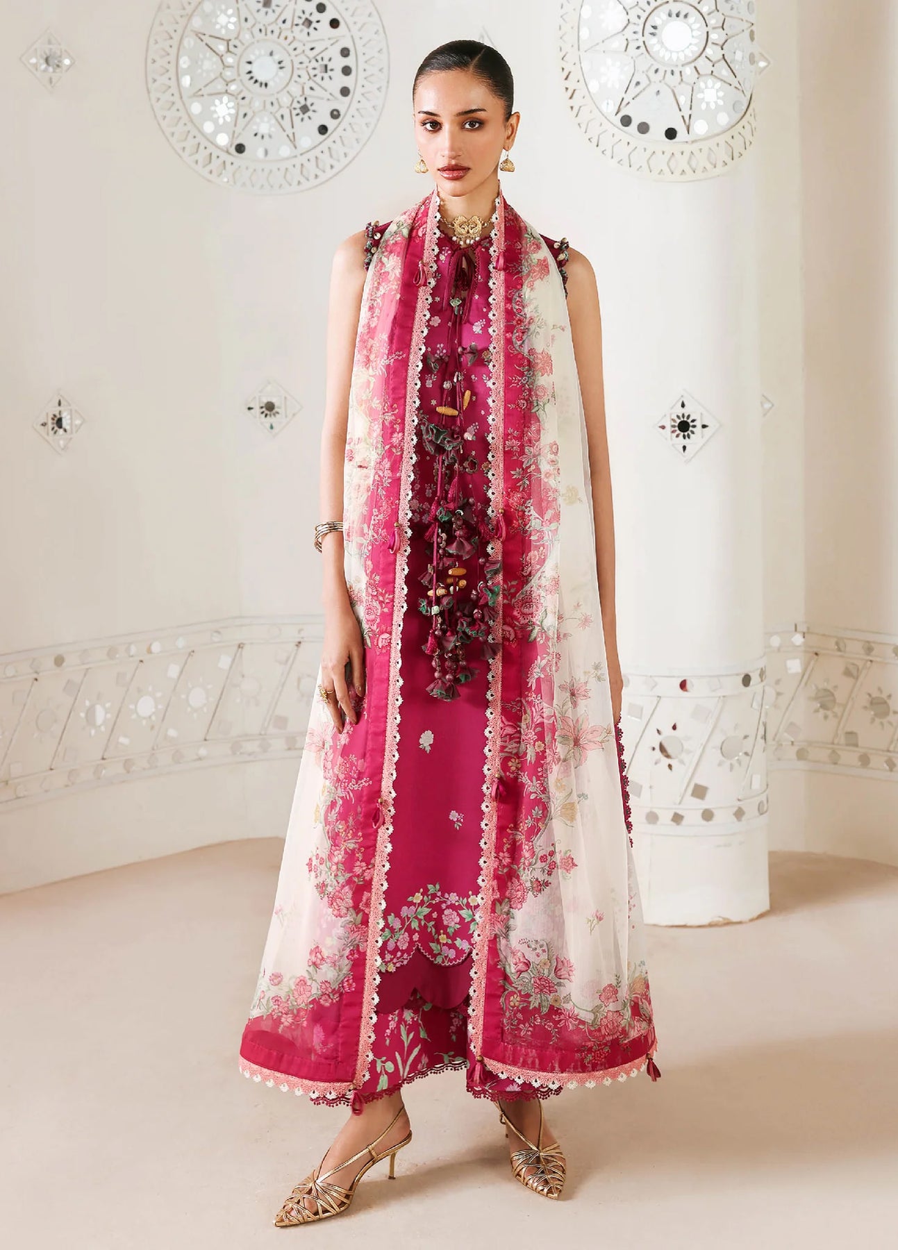 Unstitched hot pink lawn shirt featuring a graceful floral arrangement along the border and an elegantly elongated neckline, paired with a white chiffon dupatta adorned with soft pink florals. This vibrant yet airy ensemble is perfect for summers, offering a refreshing blend of bold color and lightweight comfort that keeps you effortlessly stylish in warm weather.